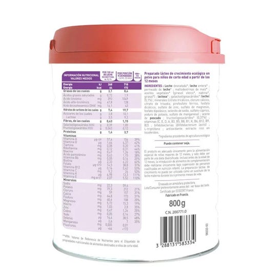 Skimmed milk formula prepared in powder form, based on natural ingredients of certified organic origin, for children from 12 months. Its composition provides the necessary nutrients for the correct growth of the little ones. Reinforced with omega 3 fatty acids, iron and vitamins that benefit the correct development of babies.