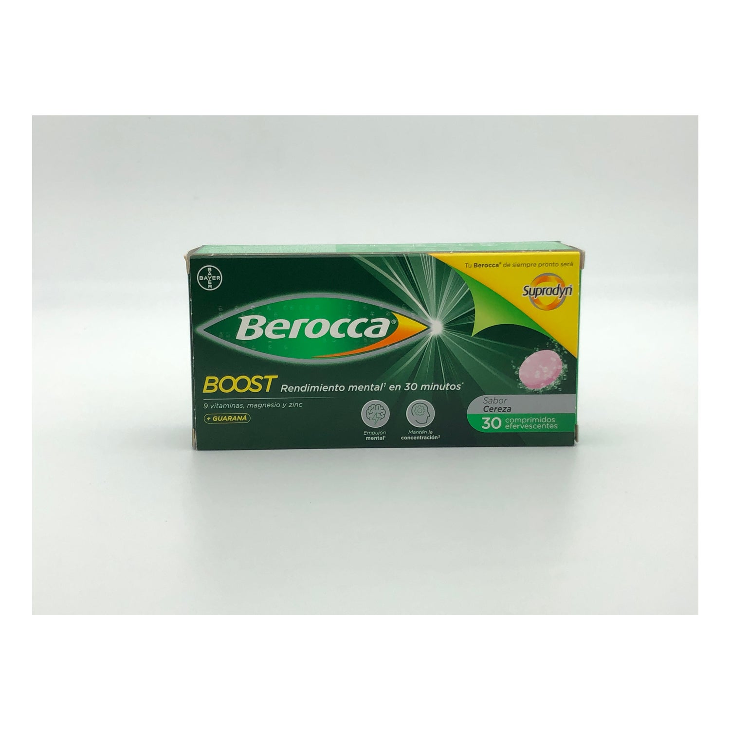 Berocca® Boost with Guarana 30comp is a food supplement in effervescent format, with a pleasant cherry flavor, which combines vitamins B and C, essential minerals and guarana to help improve mental performance and reduce the feeling of fatigue in moments of intellectual overexertion.