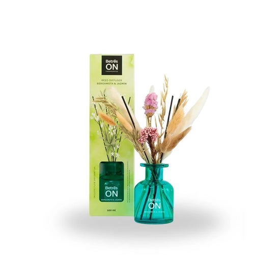 Betres On Mikado Decorative Bergamot & Jasmine 100 ml is a diffuser designed to scent and decorate the home with a fresh and natural fragrance. It combines the citrus vitality of bergamot with the floral softness of jasmine. It offers a continuous diffusion for over four weeks.