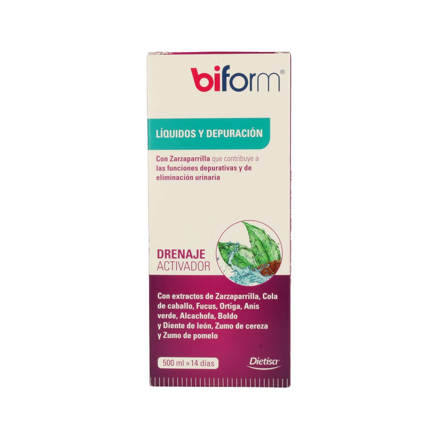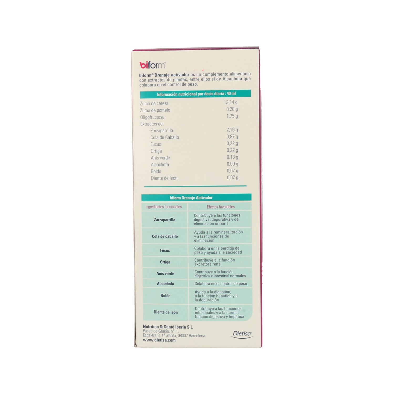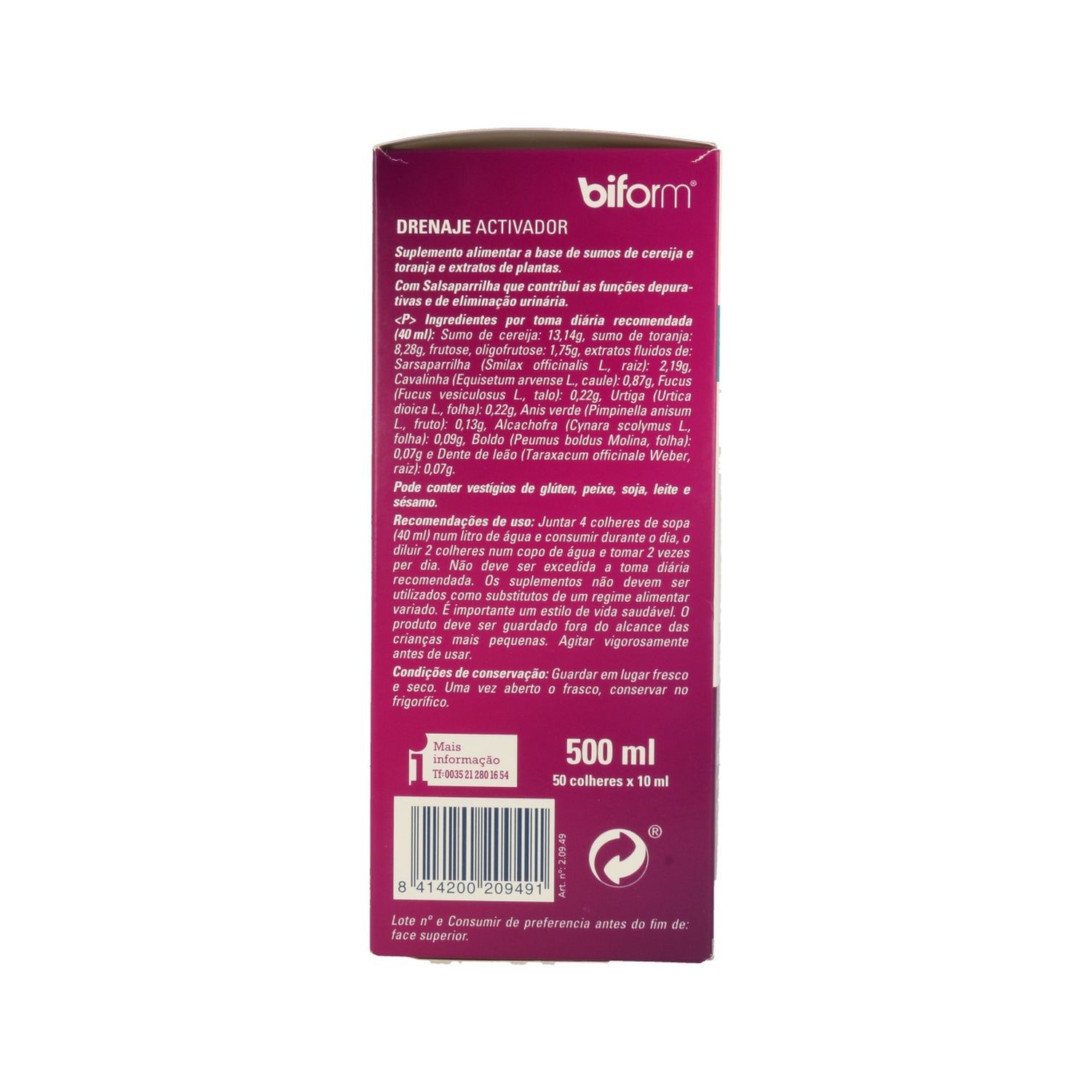 Biform Drainage Activator 500ml is a food supplement that helpseliminate fluids and purifythe body. Formulated with grapefruit and natural plant extracts with satiating effect such as sarsaparilla, horsetail, artichoke, dandelion, nettle and green anise that contribute to the purifying functions of urinary elimination. It is important to combine the product with a balanced diet and a healthy lifestyle. Suitable for all those who want to reduce fluid retention.