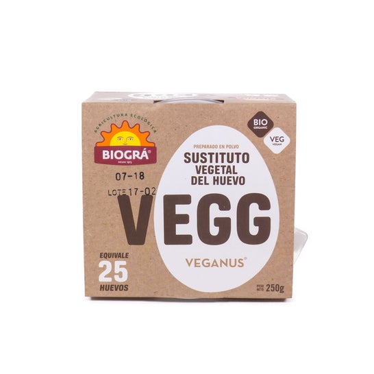 Biográ's vegetable egg substitute, a unique product that contributes to balanced vegan diets. Composed of corn starch, turmeric, gelling agent, chickpea flour, sodium bicarbonate, tartaric acid. It also provides high protein, fiber, vitamin B, iron and omega 6. Product with organic certificate. Ideal for breakfast and vegan diets, it is suitable for diabetics.
