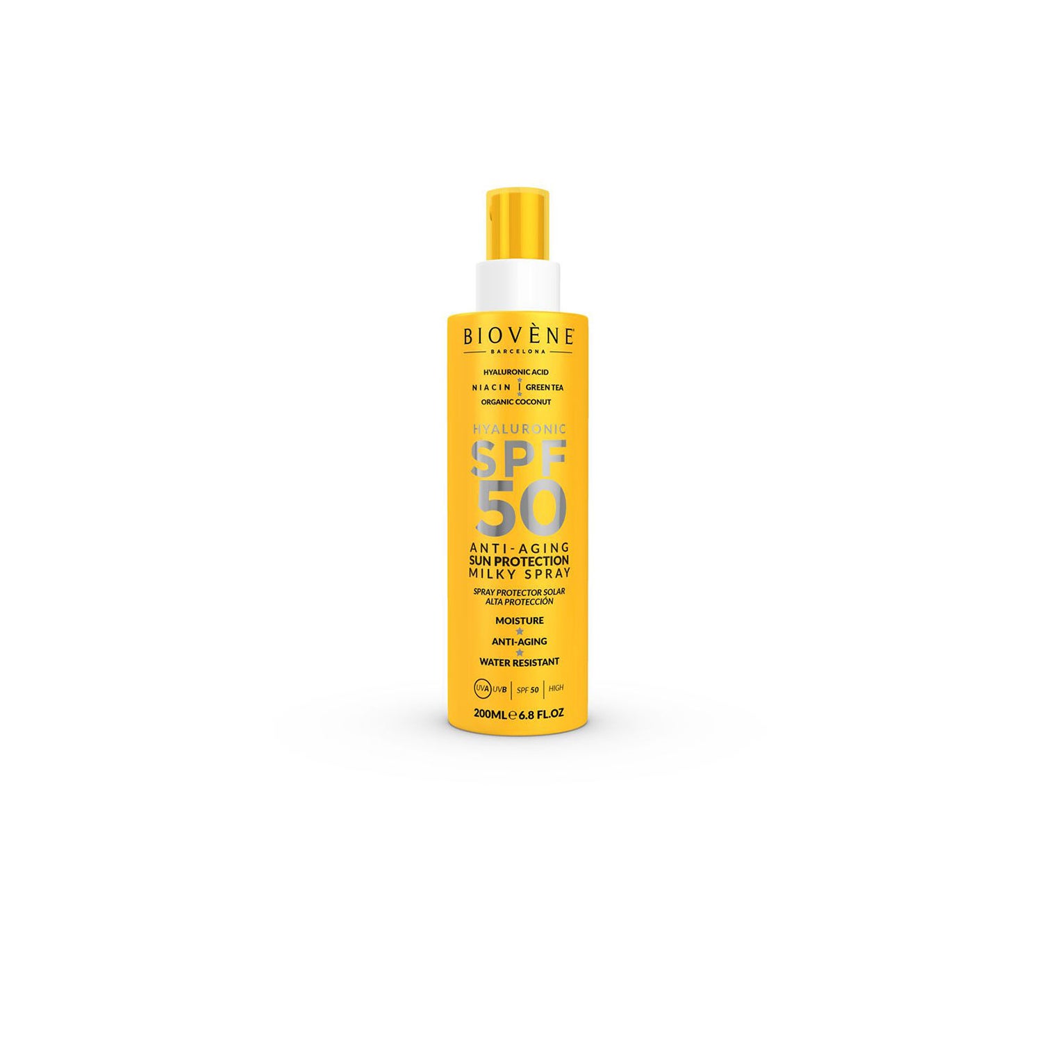 Biovène Hyaluronic Spf50 Anti-Aging Sun Protection Milk Spray is a sunscreen spray designed to provide effective defense against solar rays. This product has a sun protection factor (SPF) of 50, which offers high protection against UVA and UVB radiation, helping to prevent photoaging and the appearance of spots on the skin.