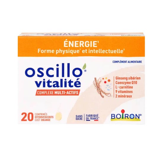 Boiron Oscillo' Vitalité Orange 20comp is a dietary supplement that features an innovative combination of 14 active ingredients in the form of effervescent tablets. This product is designed to contribute to the maintenance of physical fitness and support intellectual performance, as well as to help reduce fatigue in adults.