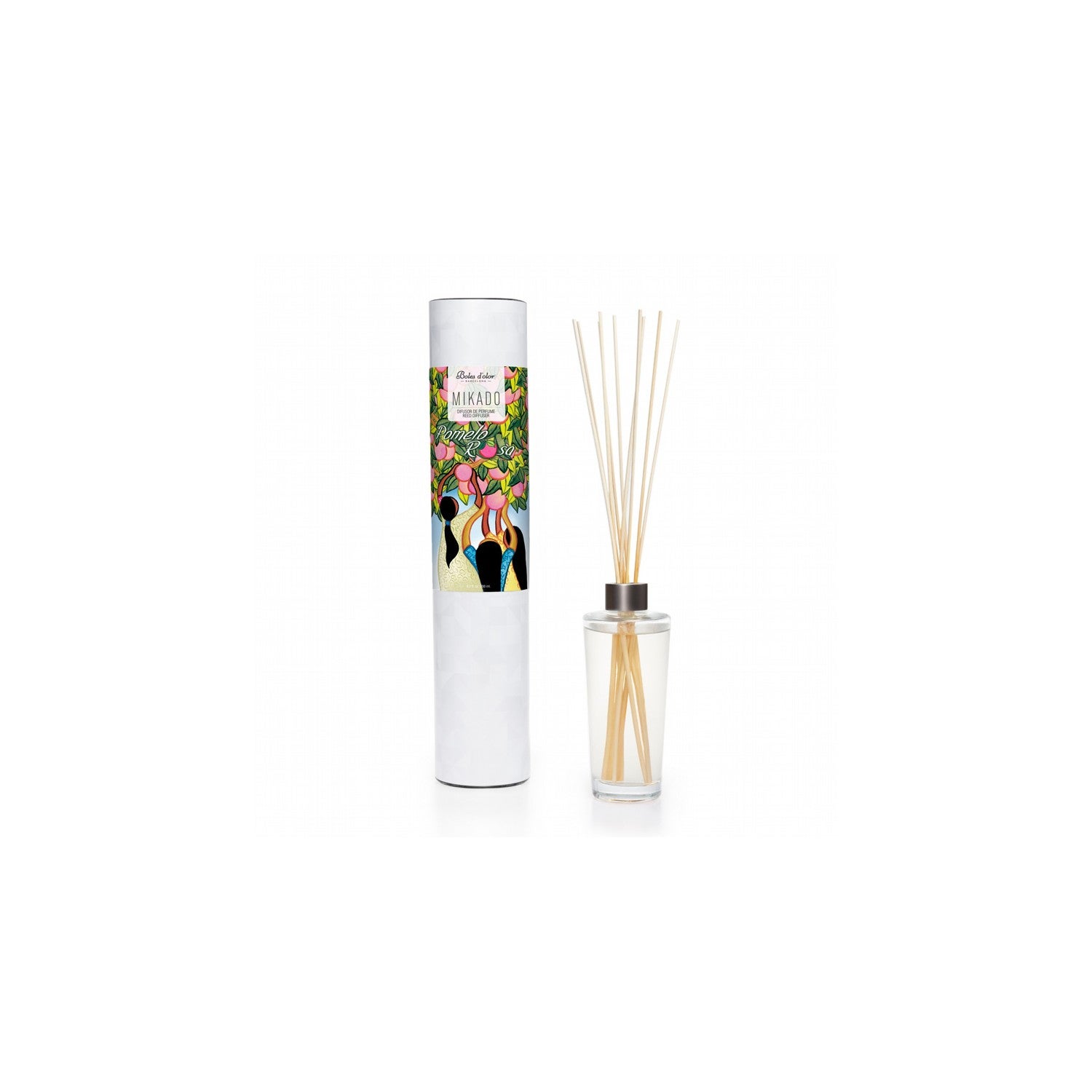 Mikado type air freshener device, made with rattan sticks and a bottle-shaped glass reservoir, containing a pleasant fragrance of neroli, sea water, pink pepper, jasmine, nutmeg, vanilla and cardamom. It favours the homogeneous and continuous diffusion of the fragrance inside the home. Its ingredients provide a long-lasting scent, which remains active for up to three months.
