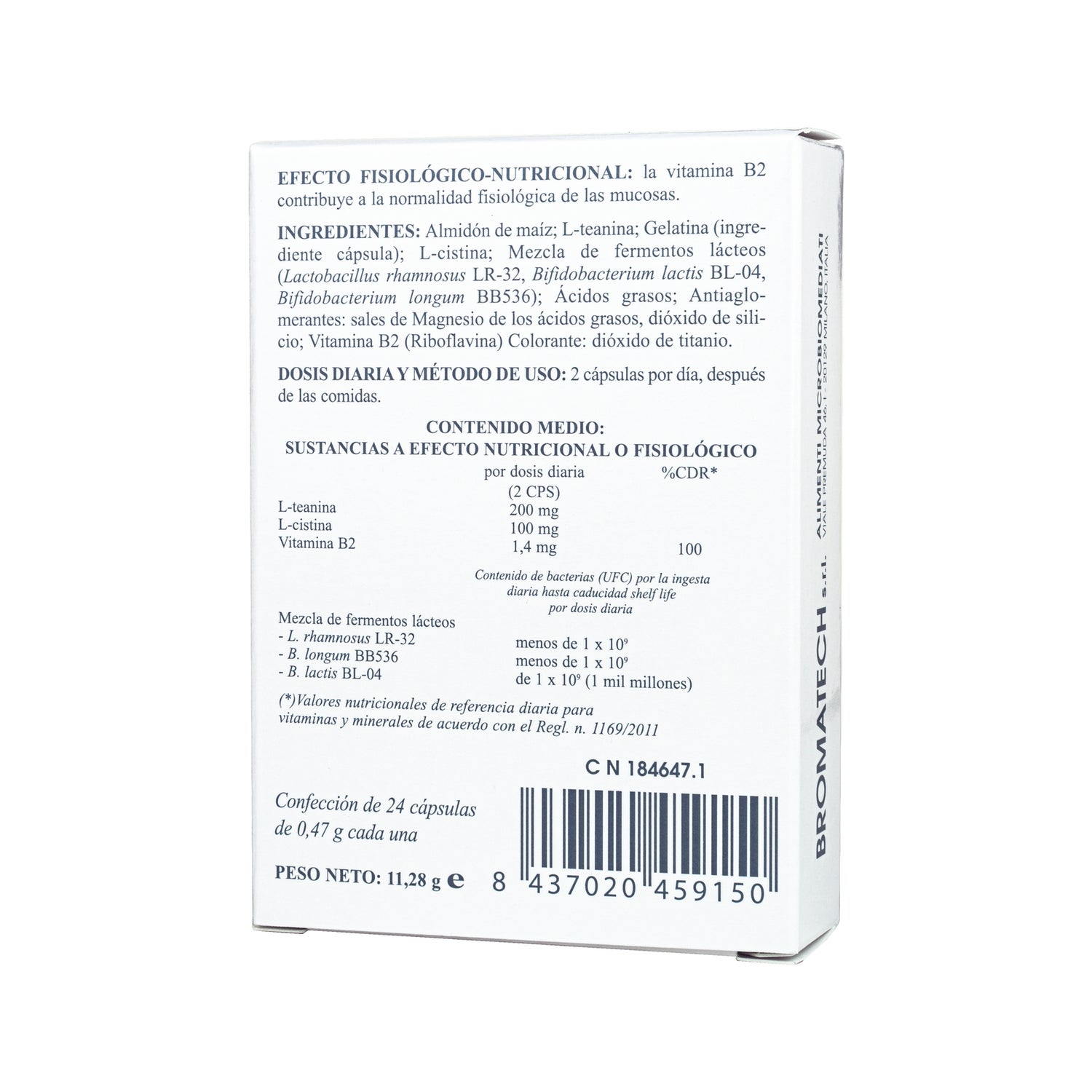Dietary supplement in capsule format, made from L-theanine, L-cysteine, vitamin B2 and lactic ferments, which help protect the integrity of the intestinal barrier. Helps control the escape of undesirable cytokines to organs such as the brain, adipose tissue and cardiovascular system.