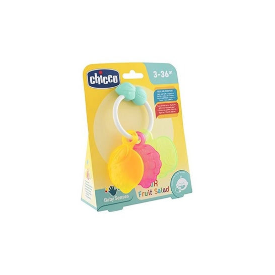 Baby teether with three fun and colourful fruits. It is designed with bright colours to attract the baby's attention, it is ultra-light and easy to grip thanks to its ring. It is filled with air and is ideal for when the baby's first teeth come out because of its different reliefs and textures. Format of 8X16X6,5 cm.