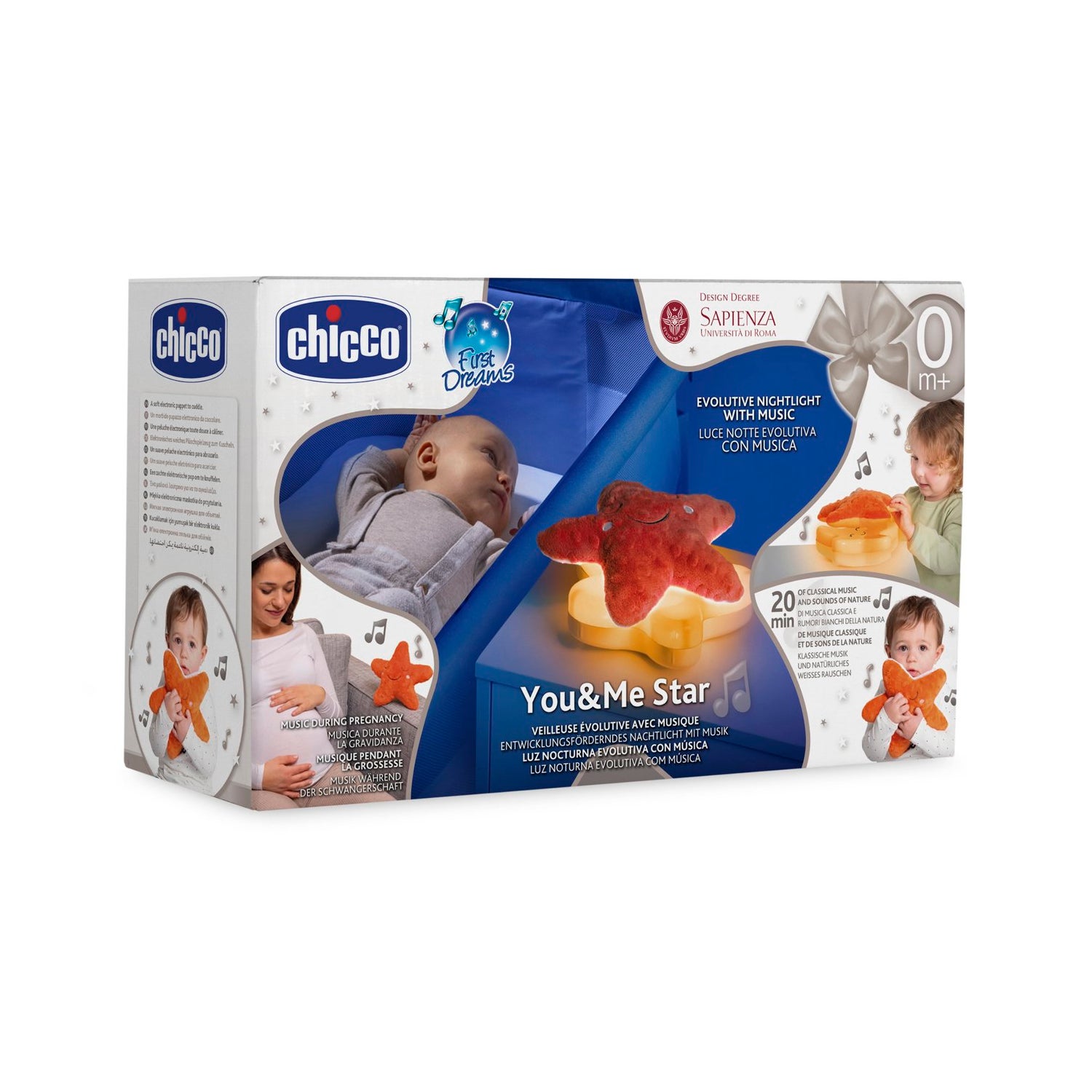 Chicco Star You&Me 0M+ is a product designed to create a cozy and magical nighttime environment. This soft star emits a warm and gentle light, accompanied by pleasant melodies, perfect for establishing a sleep ritual.