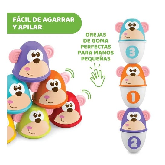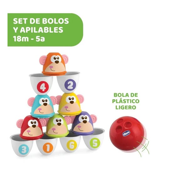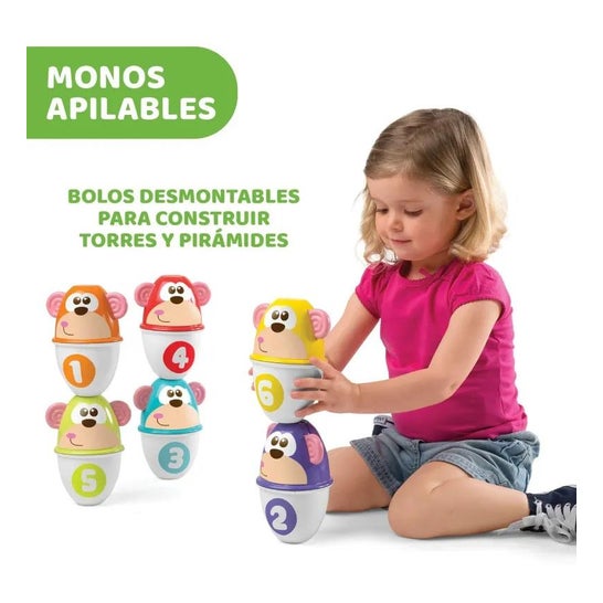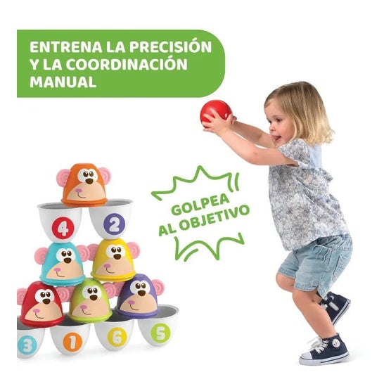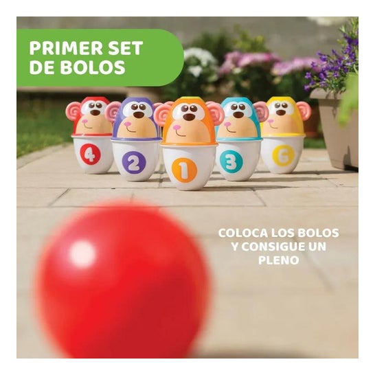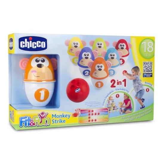 Chicco Fit and Fun 18m+ bowling suits include a plastic bowling ball imitating a bowling ball and eight pins with monkey faces to play with, each has a different color and number, which allows us to place ourselves in different order and in different ways, designed without tips and dangerous areas to avoid causing injury to children.