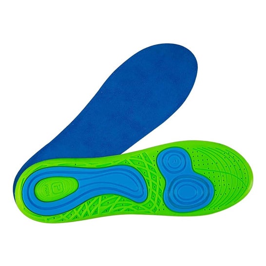 Anatomical gel insoles with heel reinforcement and cushioning grooves. They provide comfort and relief to the feet while absorbing the impact of body weight. Their design helps to reduce pressure on the metatarsal area in both walking and static positions. Suitable for daily use.