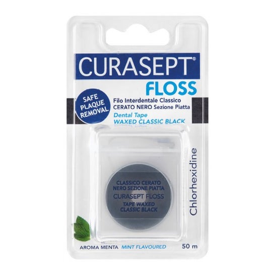 Curasept Floss is a black waxed dental floss with chlorhexidine, 50 meters long and 1 unit.