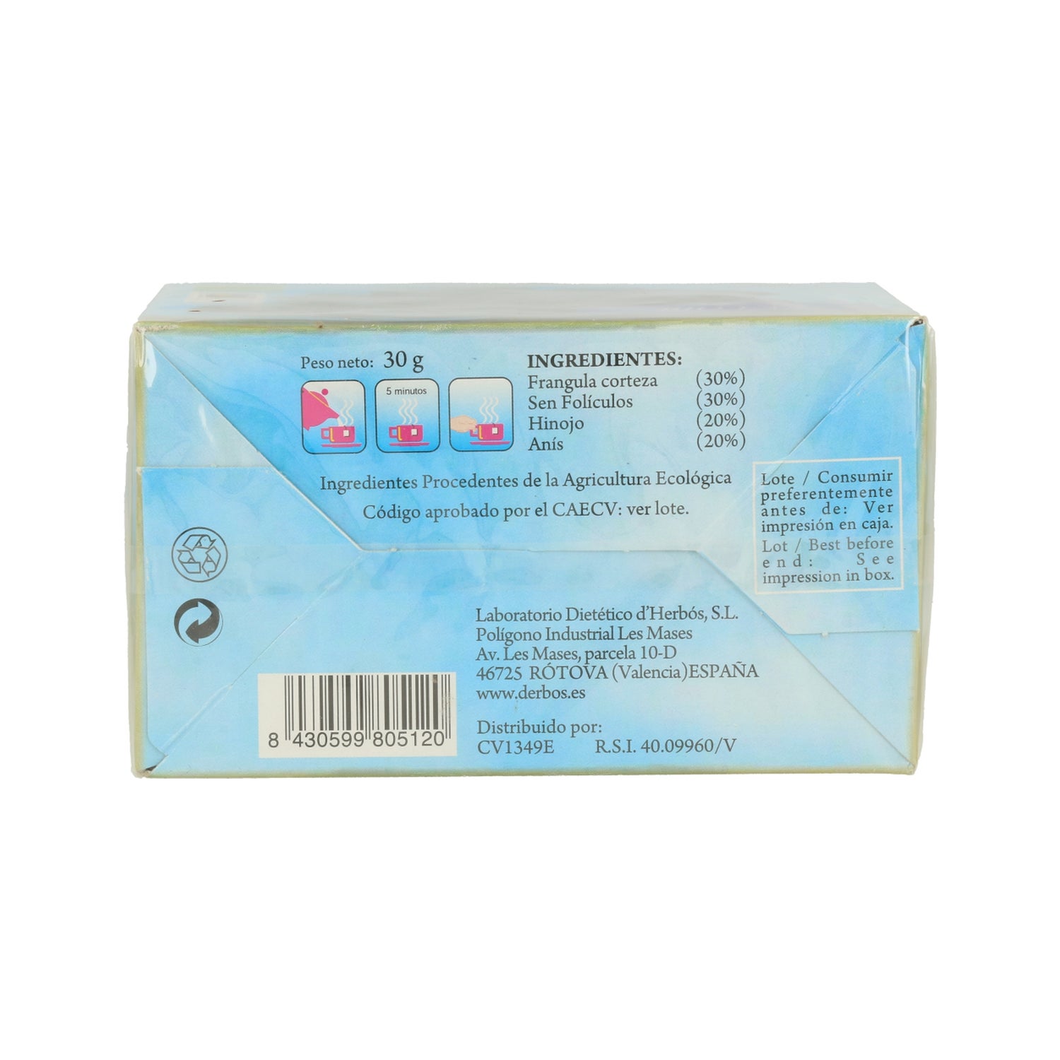Derbos Bio Lax Infusion 20 Sachets is an infusion preparation that contains Buckthorn, Senna, Fennel, and Anise, ingredients that promote good digestion. It is recommended to take one sachet a day, preferably before bedtime, with a glass of water. Its use is not advised during pregnancy, breastfeeding, or in children under 12 years old. In case of discomfort or adverse effects, you should stop using it and consult a doctor. The main ingredients are Cellulose fibre filter, Plantago ovata extract, and Buckthorn extract.