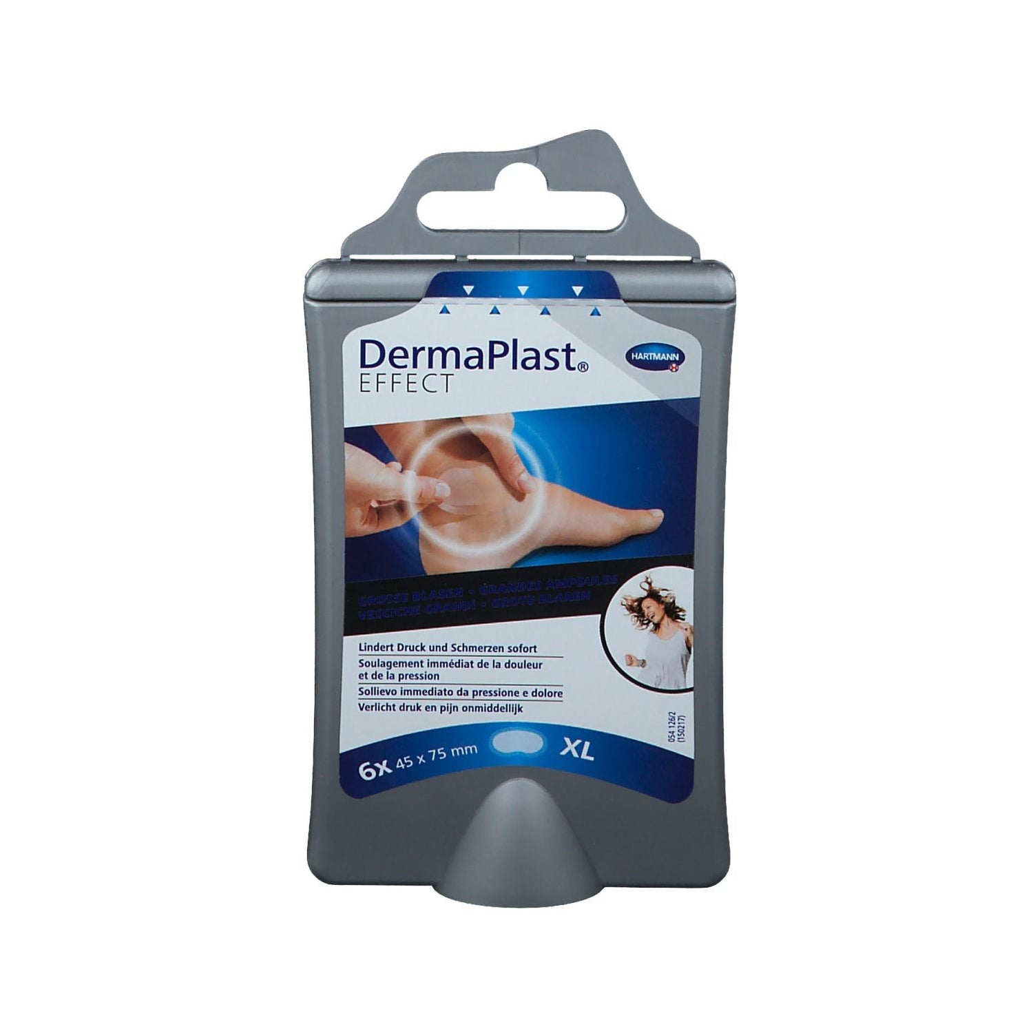 Hartmann DermaPlast Effect XL Large Blisters 6 dressings are blister dressings with protective padding. Based on hydrogel and hydrocolloid, they soothe pain and accelerate healing. Dimensions: 45 x 75 mm, waterproof.