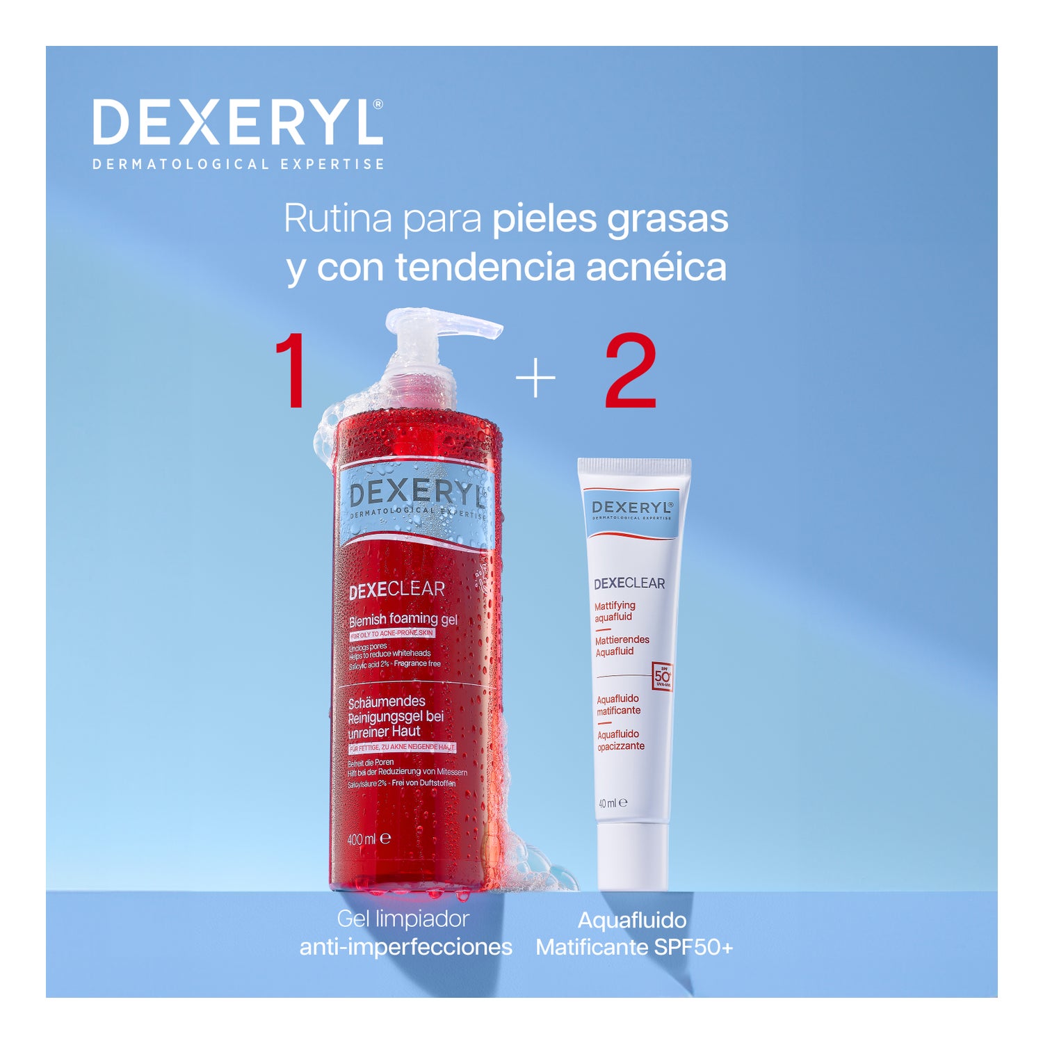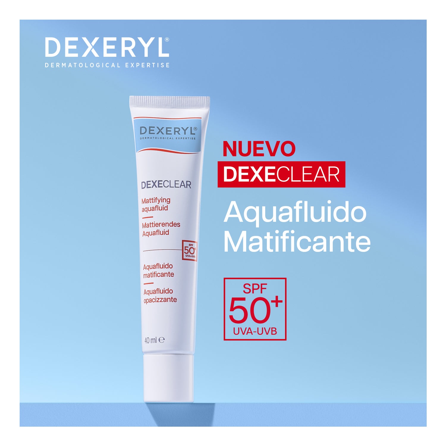DEXECLEAR Mattifying Aquafluid SPF 50+ offers three essential benefits: mattifies, hydrates, and protects the skin from UV rays. Its formula includes 1% P-Refinyl®, which helps reduce pore size, glutamic acid with sebum-reducing effect, and a UVB/UVA filtering complex. All of this provides immediate absorption for a dry touch sensation.