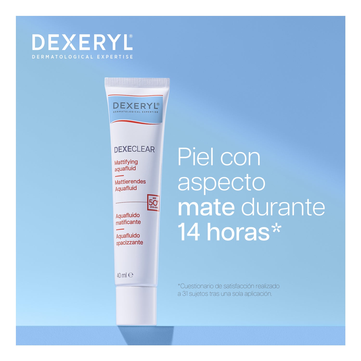 According to a satisfaction questionnaire, 94%* of users confirm the product's effectiveness in controlling shine, 91%* notice a daily reduction in excess sebum, and 74%** of participants feel that their skin remains mattified for 14 hours. The light texture of DEXECLEAR Mattifying Aquafluid SPF 50+ ensures hydration for six hours*** after the first application.