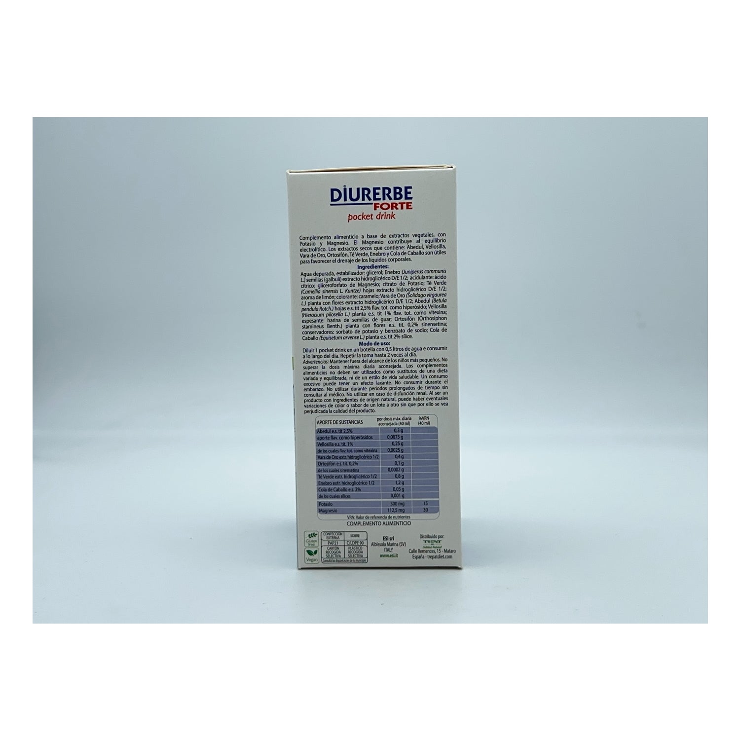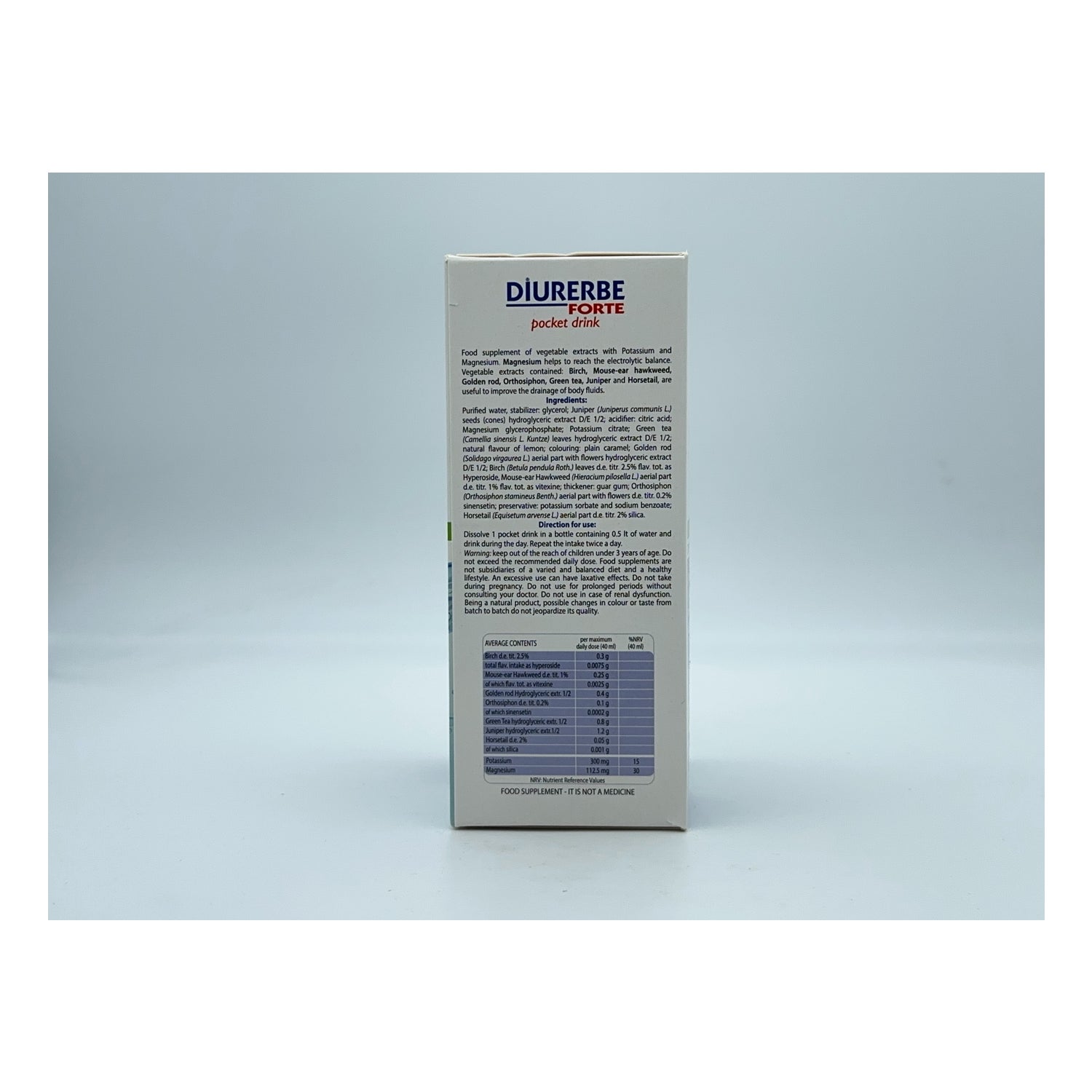 Diurerbe Forte Pocket Drink helps to expel excess fluid accumulated in the body, making you feel lighter and encouraged. Reduces edema of joints lower produced because of a wrong movement or diet, leaving you with a slight citrus flavor.