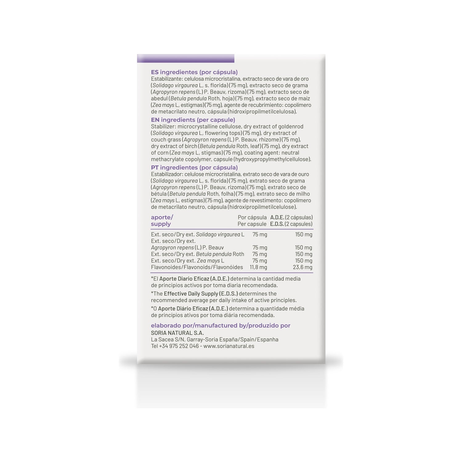 Freeze-dried extract of goldenrod, freeze-dried extract of couch grass, freeze-dried extract of birch, freeze-dried extract of corn stigmas, stabilizer: microcrystalline cellulose; coating agent: neutral copolymer. Does not contain preservatives or colouring agents.