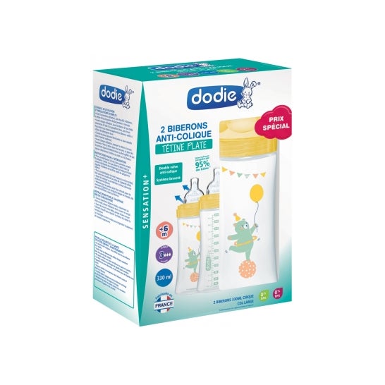 Box of two baby bottles Dodie Sensation for babies 6 months or older. In yellow.