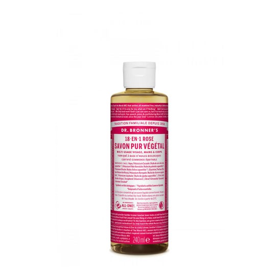 Dr. Bronners Sav Liq Rose 240ml is a multi-purpose liquid soap ideal for daily skin hygiene, designed for cleaning the body, face, and hands. This product is formulated with organic vegetable oils and has Fair Trade certification, ensuring effective cleaning without compromising the care of the most demanding skin.