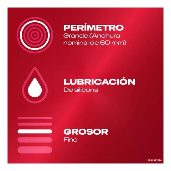 Condoms extra large perimeter and with a greater sensitivity thanks to its extra-thin thickness of 65 microns. Nominal width 57mm. Size XL. With silicone lubrication to improve the smoothness in relationships. Easy-On anatomical shape with reservoir. Made of natural rubber latex. Pleasant smell.