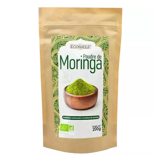 Ecoidées Organic Moringa Powder 200g is a potent cocktail of 100% vegetable and gluten-free nutrients, prepared from the natural dried leaves of the moringa tree, harvested in India.Moringa is a source of vitamins B, C, provitamin A and K, as well as being rich in essential amino acids, proteins, iron, potassium and manganese. It is known to stimulate the immune system and reduce fatigue. In addition, Moringa oil, used both internally and externally, is renowned for its skin benefits.food supplements should be used as part of a healthy lifestyle and not consumed as a substitute for a varied and balanced diet.