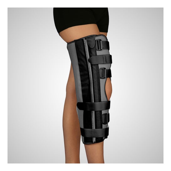 Knee immobiliser 3 panels made of comfortable and breathable material, foam and velor. It incorporates three lateral and posterior conformable and removable whales that can be adapted to achieve the desired degree of flexion. It favours adaptation to all leg perimeters thanks to its two movable side panels. Contains a Velcro fastening system with rings. Frees the patella, latex-free.