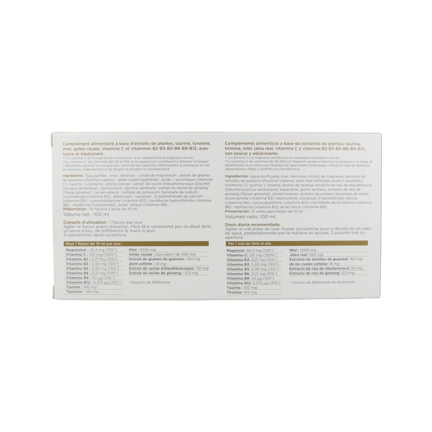 Its formula, based on plant extracts (eleutherococcus, ginseng, guarana), taurine, tyrosine, honey, royal jelly, vitamin C and several B vitamins, promotes psychological and physical tone. Food supplements should never replace a healthy and balanced diet.