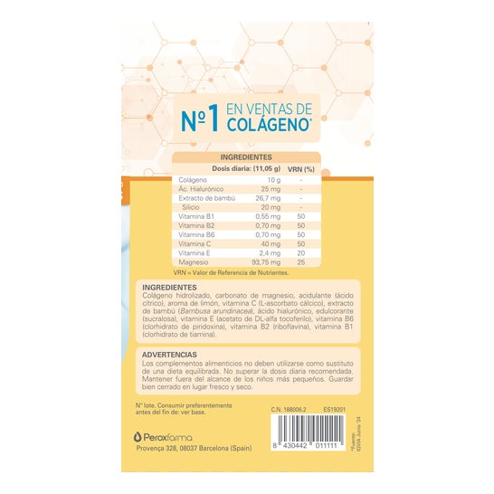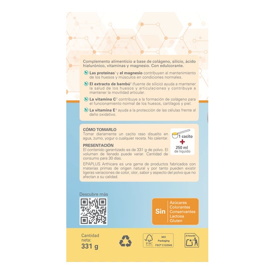 Food supplement that helps to recover the elasticity of the joints, to reduce pain by improving mobility and reduce the symptoms of fatigue. It contains collagen, silicon, hyaluronic acid, magnesium and vitamins B1, B2, B6 and C. The combination of this formula provides the body with properties that promote the formation and synthesis of collagen, the natural regeneration of tissues such as cartilage, tendons and bones. It also helps to improve joint mobility, to prevent and recover from sports injuries and to reduce tiredness and fatigue.