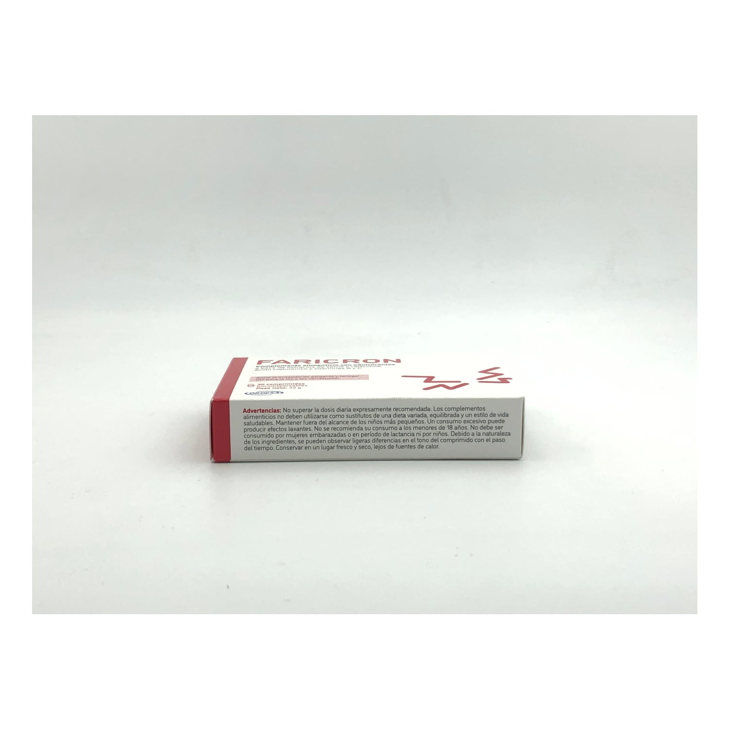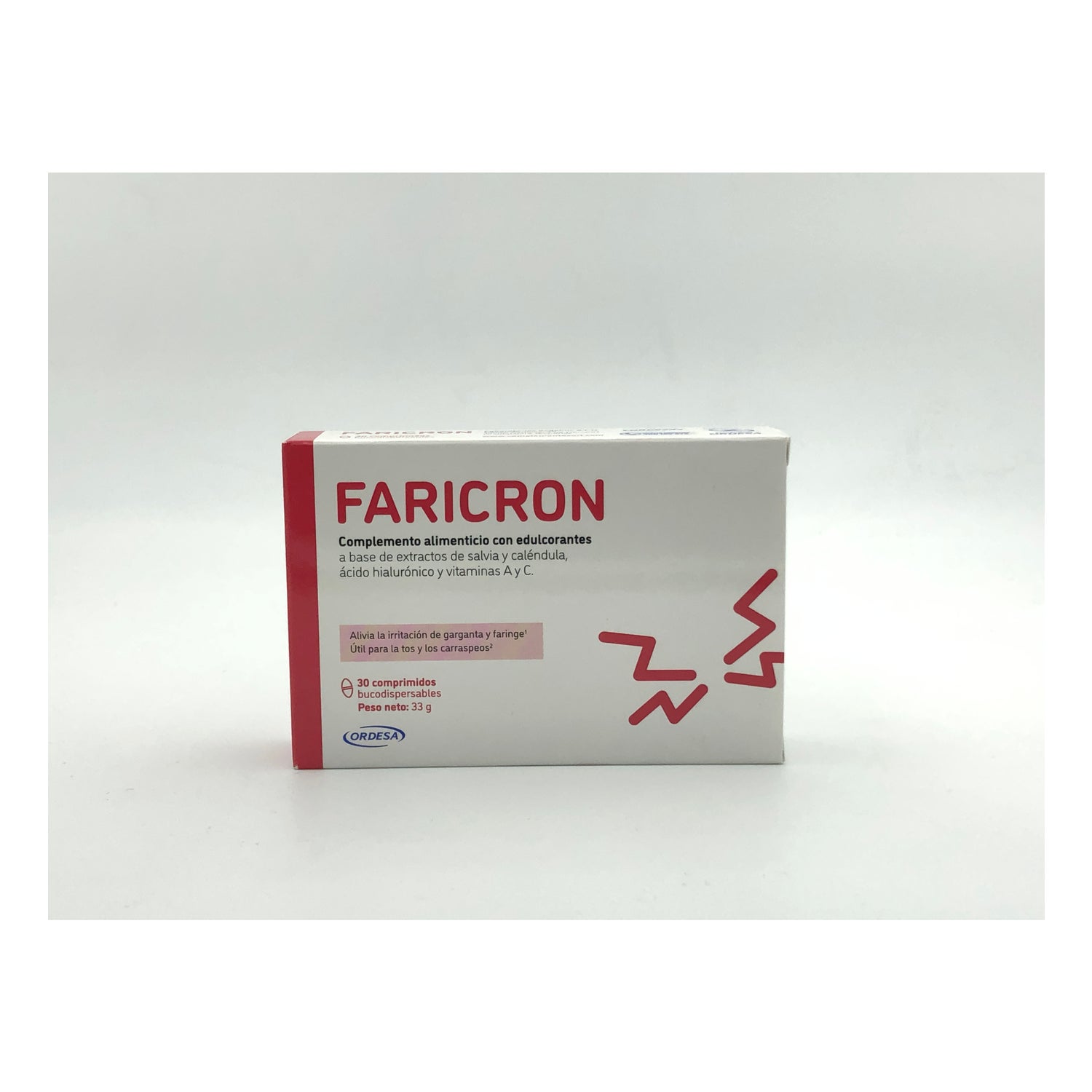 Composition per tablet Faricron: Calcium ascorbate (vitamin C), dry extract of flowers of Malva syivestris L. 40 mg, Lysozyme Hcl 40 mg, dry extract of flowers of Calendula officinalis L. 25 mg, hyaluronic acid 20 mg, nicotinamide (vitamin B3), dry extract of root of Curcuma longa L. 100 mg, selenomethionine 5.5 mg, dry extract of Sophora japonica L. flowers 5 mg, retinol acetate (vitamin A), pyridoxine Hcl (vitamin B6), thiamine Hcl (vitamin B1), riboflavin (vitamin B2), folic acid (vitamin B6). 5 mg, retinol acetate (vitamin A), pyridoxine Hcl (vitamin B6), thiamine Hcl (vitamin B1), riboflavin (vitamin B2), folic acid (vitamin B9), cyanocobalamin (vitamin B12), peppermint flavouring, honey powder (flavouring), crystalline xylitol (bulking agent), sorbitol (bulking agent), magnesium stearate (anti-caking agent).