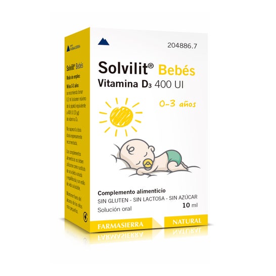 Farmasierra Solvilit Babies Vitamin D3 400 10ml is a dietary supplement that supports the proper immune system function and normal bone, teeth and muscle growth and development in babies. Made from vitamin D3, a fat-soluble vitamin that facilitates calcium and phosphorus absorption, two essential minerals for bone and teeth development in infants and children.