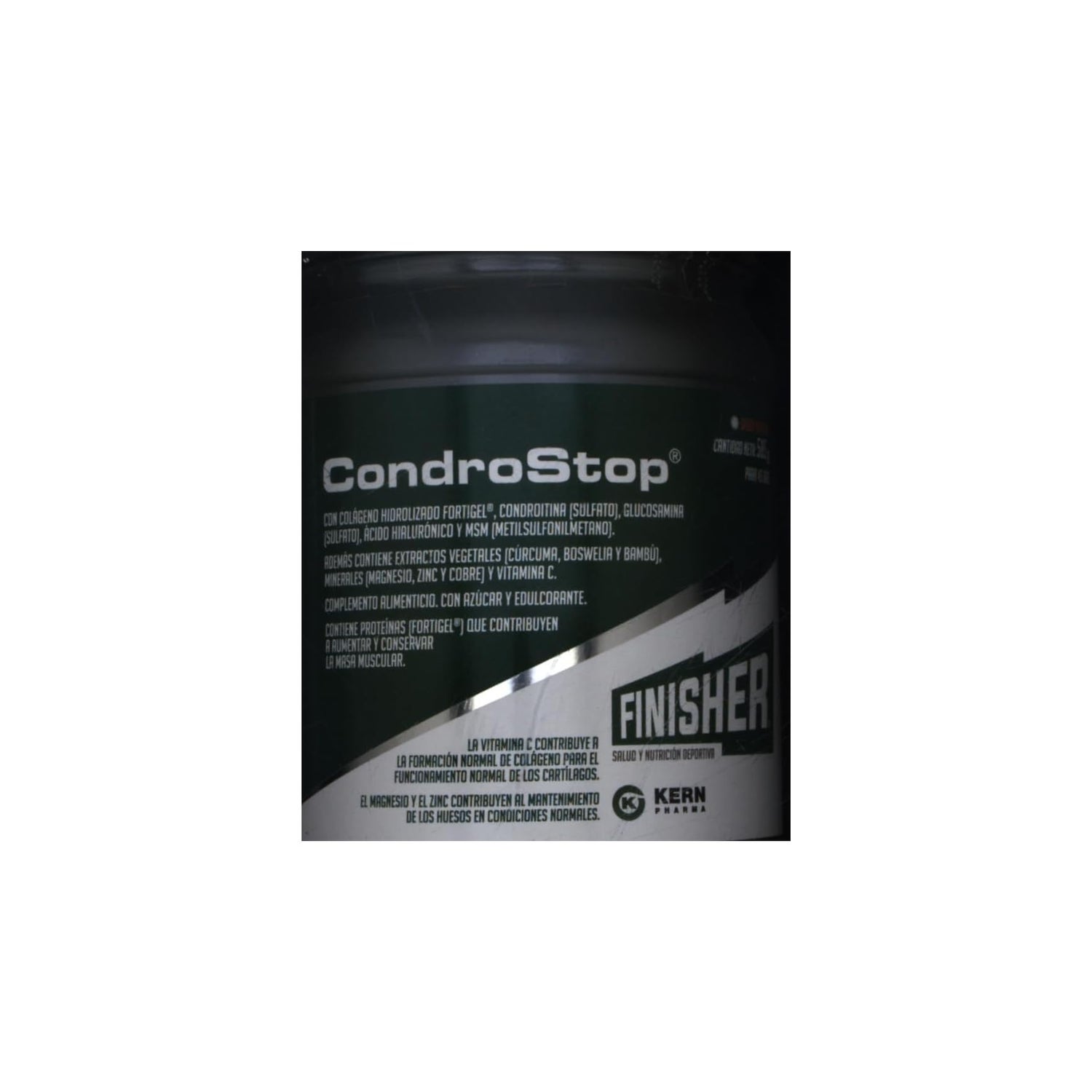 Finisher Condrostop 585g pot isa food supplement based on hydrolyzed collagen, chondroitin, glucosamine, hyaluronic acid and MSM and enriched with vitamins, minerals and plant extracts.