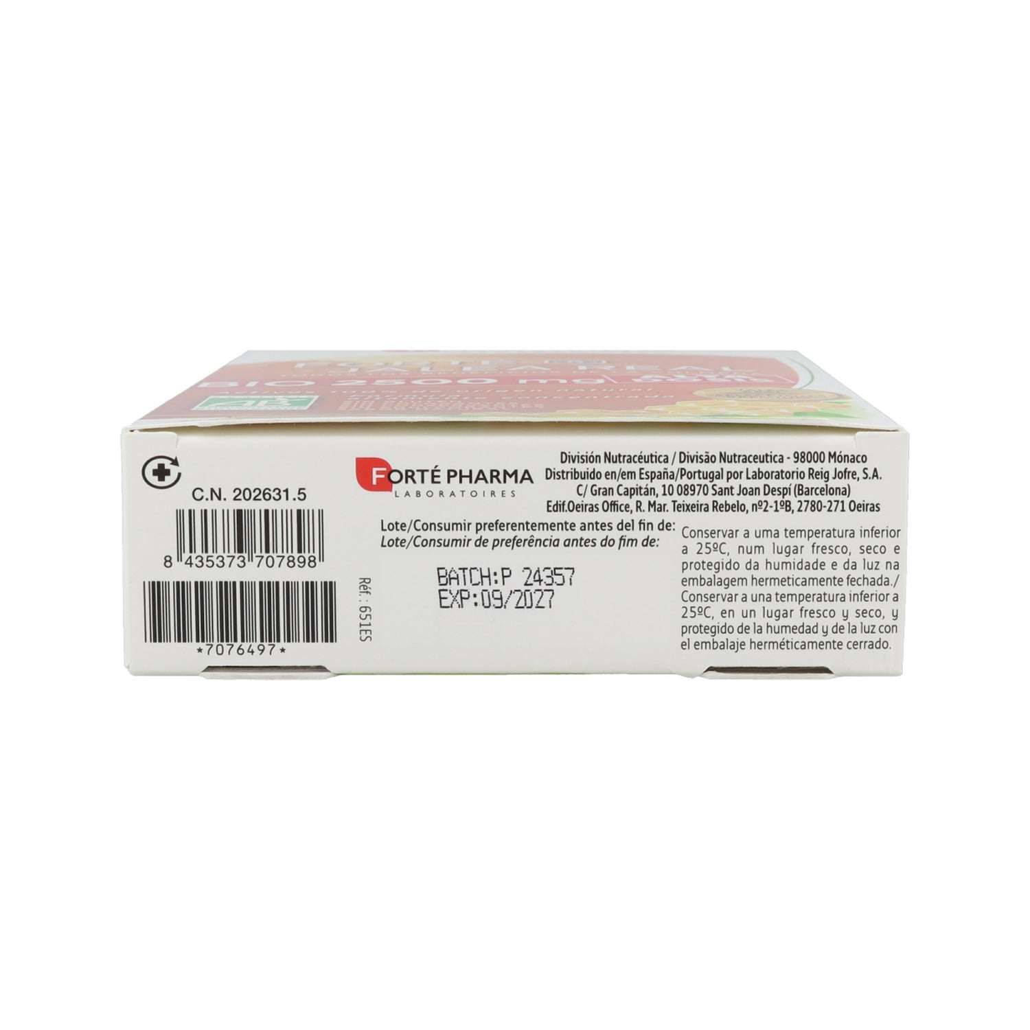 Food supplement for daily consumption, which aims to help a balanced nutrition. Its formula is based on all-natural components, such as royal jelly and honey. It is a product that does not contain dyes, preservatives or gluten. Forte Pharma's food supplement can be consumed only by people who do not suffer from asthma and allergies to products such as honey or any other type of atopic condition. In order for the product to support good daily nutrition, it should be consumed once a day. This dose is recommended to be taken in the morning, mixing the liquid in the capsule with a glass of water or any fruit juice. Its intake will help the nutrients consumed during the day to be better used by the body.