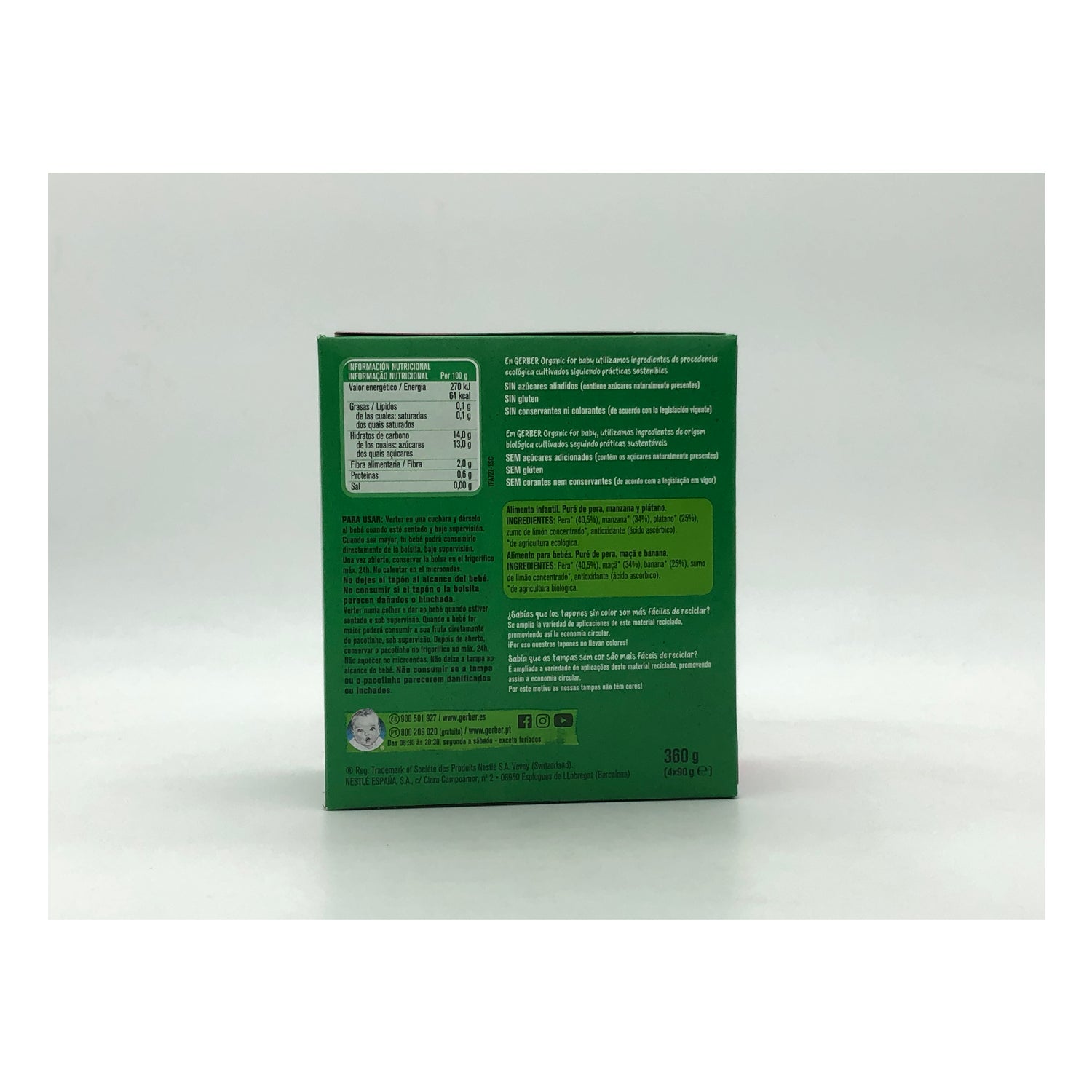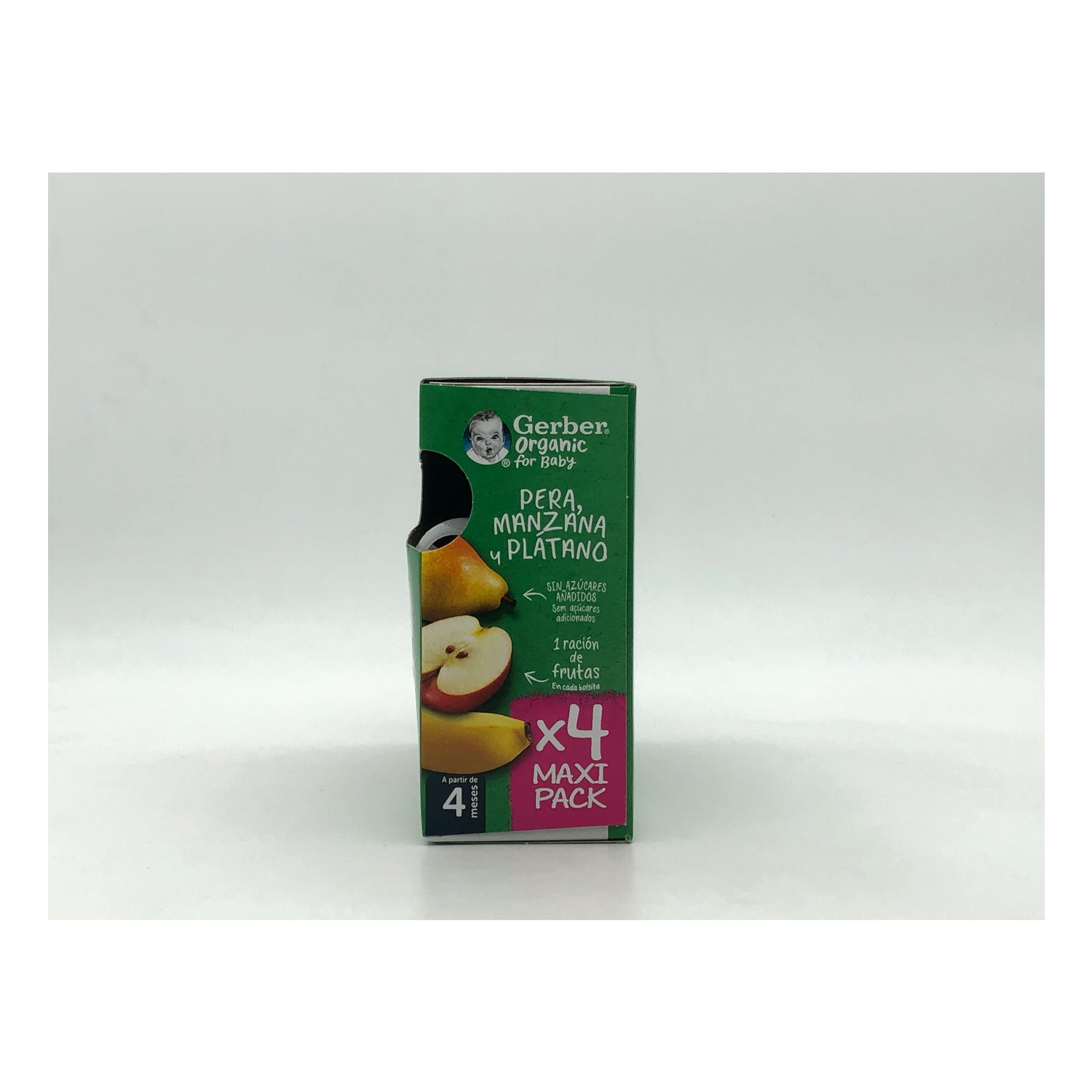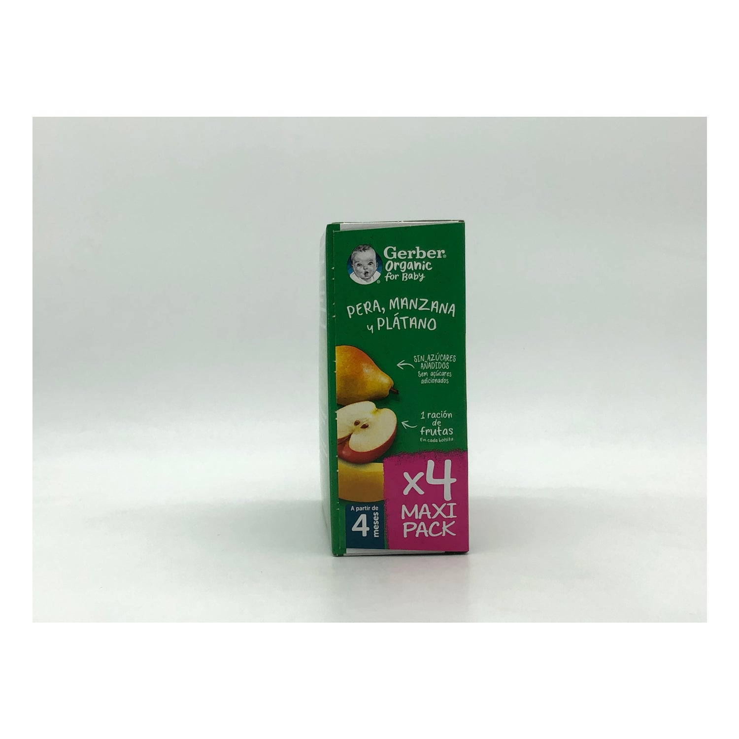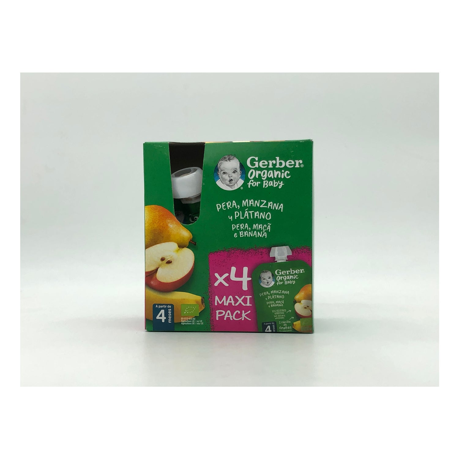 Gerber Organic Puree Pear, Apple and Banana 4x90g is a 100% organic fruit puree based on banana, apple and pear. It is suitable for babies from 4 months of age, being a healthy option to introduce solid foods to the baby's diet. It contains no added sugars, no gluten, no dyes or preservatives or palm oil.