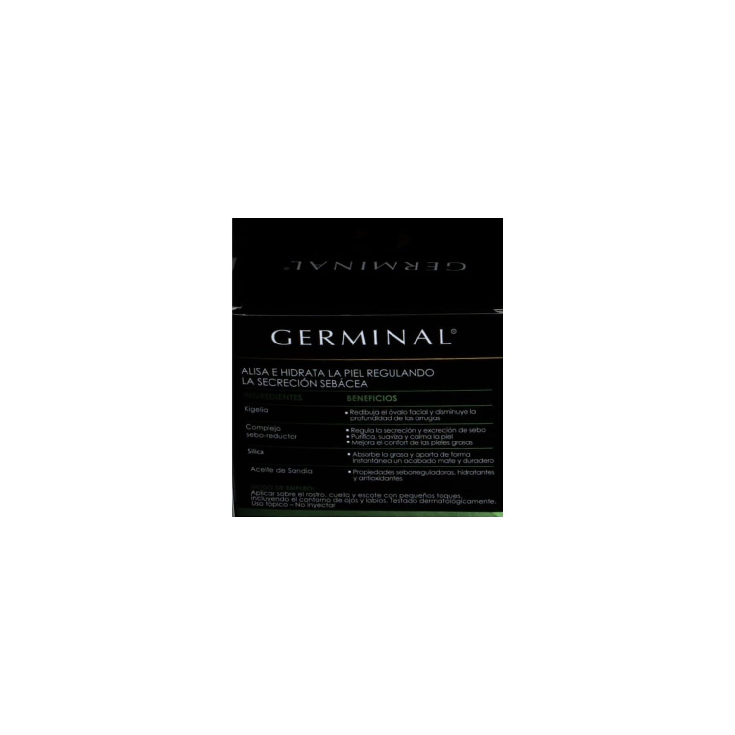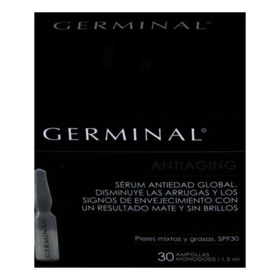 Germinal Anti-Aging Treatment for Oily Combination Skin 30 Ampoules of 1.5 ml is a product designed to offer moisturizing and purifying properties. Its formulation helps to regulate oil production, achieving well-hydrated skin with a matte finish.
