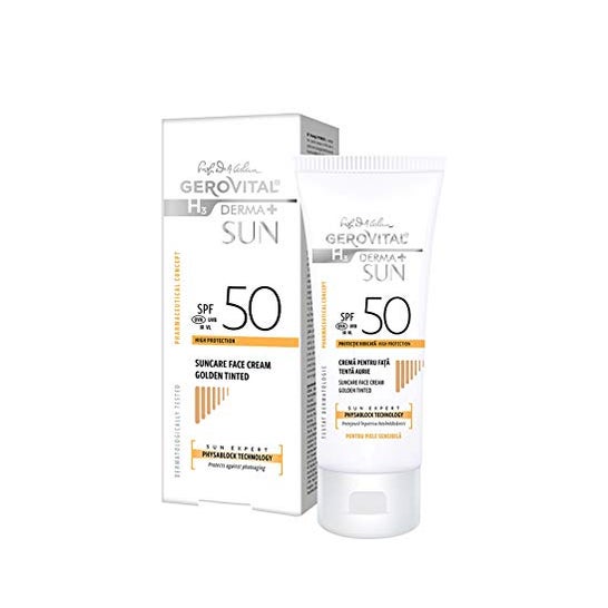 Gerovital H3 Facial Sunscreen SPF50 Golden Tone 50ml offers an exceptional facial sun protection with a natural golden finish. Designed for normal to dark or tanned skin, this cream from GEROVITAL provides high defense against the sun and a luminous, healthy tone.
