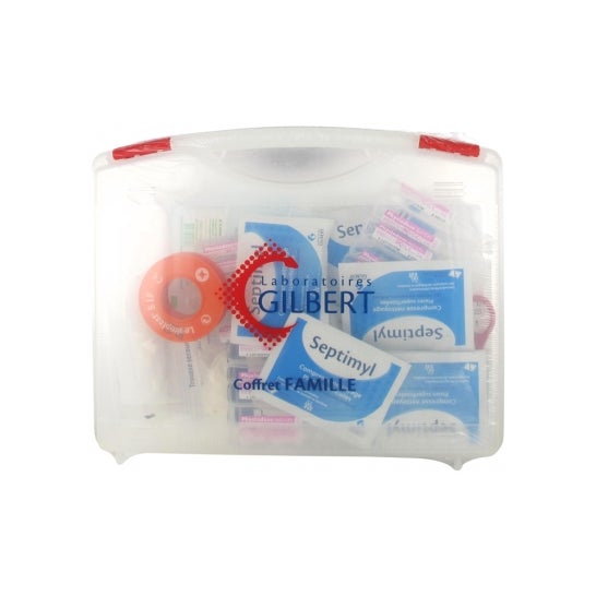 First aid kit of family medical emergency products presented in a practical medical box where you can store them. Includes scissors, tweezers for splinters, protective vinyl gloves, 5 gauze of 5x5cm, 10 plasters, 4 plasters for blisters, a bandage, adhesive tape, 12 cleaning compresses and 15 single-dose physiological serums of 5ml.
