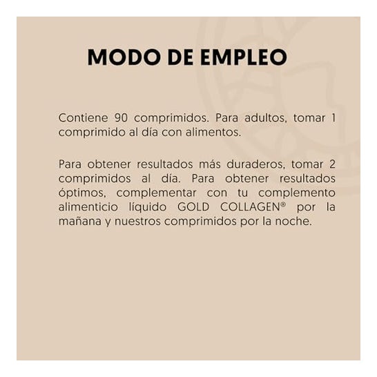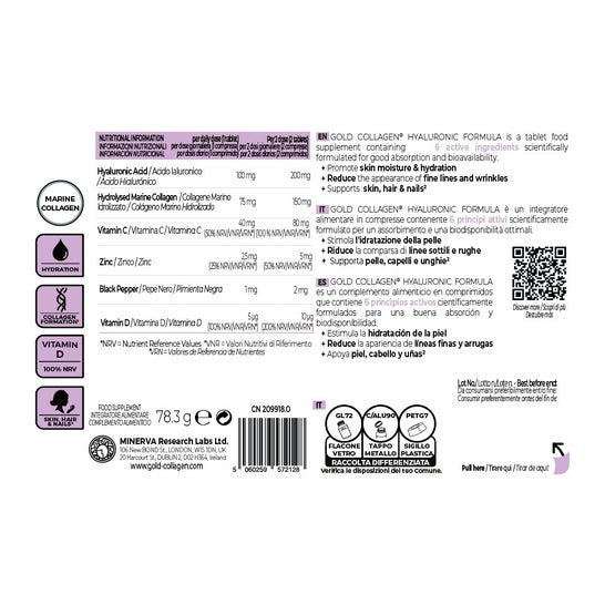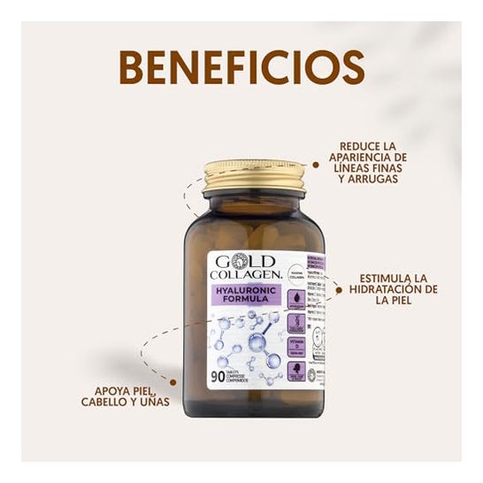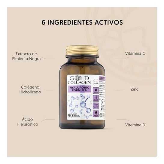 Gold Collagen Hyaluronic Formula 90comp is a food supplement with hyaluronic acid and vitamin C that helps prevent the loss of elasticity and hydration of the skin. It also helps to maintain good joint health. Contains Marine Collagen.