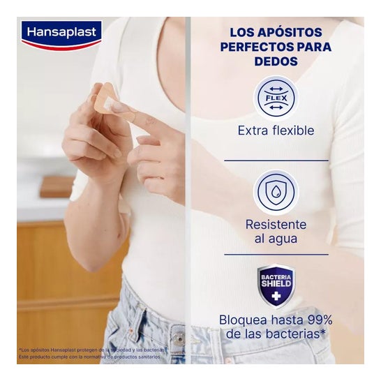 Dressings that help protect the delicate skin of the fingertips. With a special design that adapts to the edges of the hands and favours skin healing. They are very flexible and adhesive, allow movement and are painless to remove. They contain an absorbent compress in the centre and are beige. They are made of a material that adapts to motricity and repels water. They come in a box with 10 units.