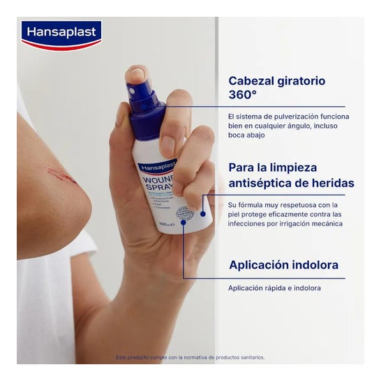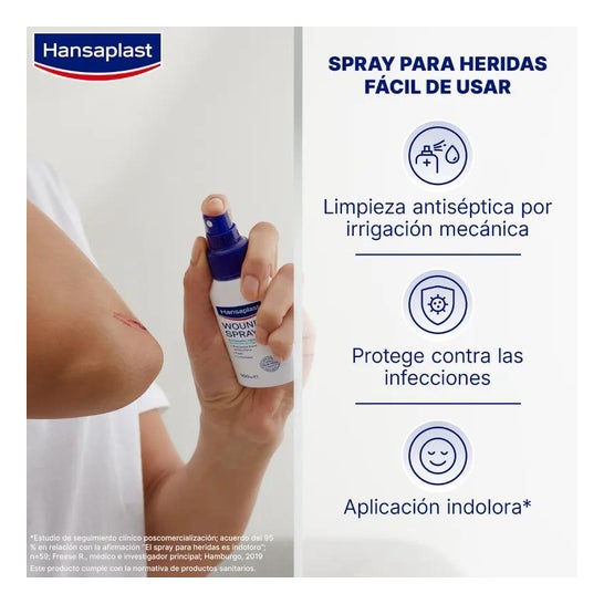Hansaplast Wound Spray 100ml is a spray for antiseptic cleaning of wounds. Does not stain clothes. Quick application.