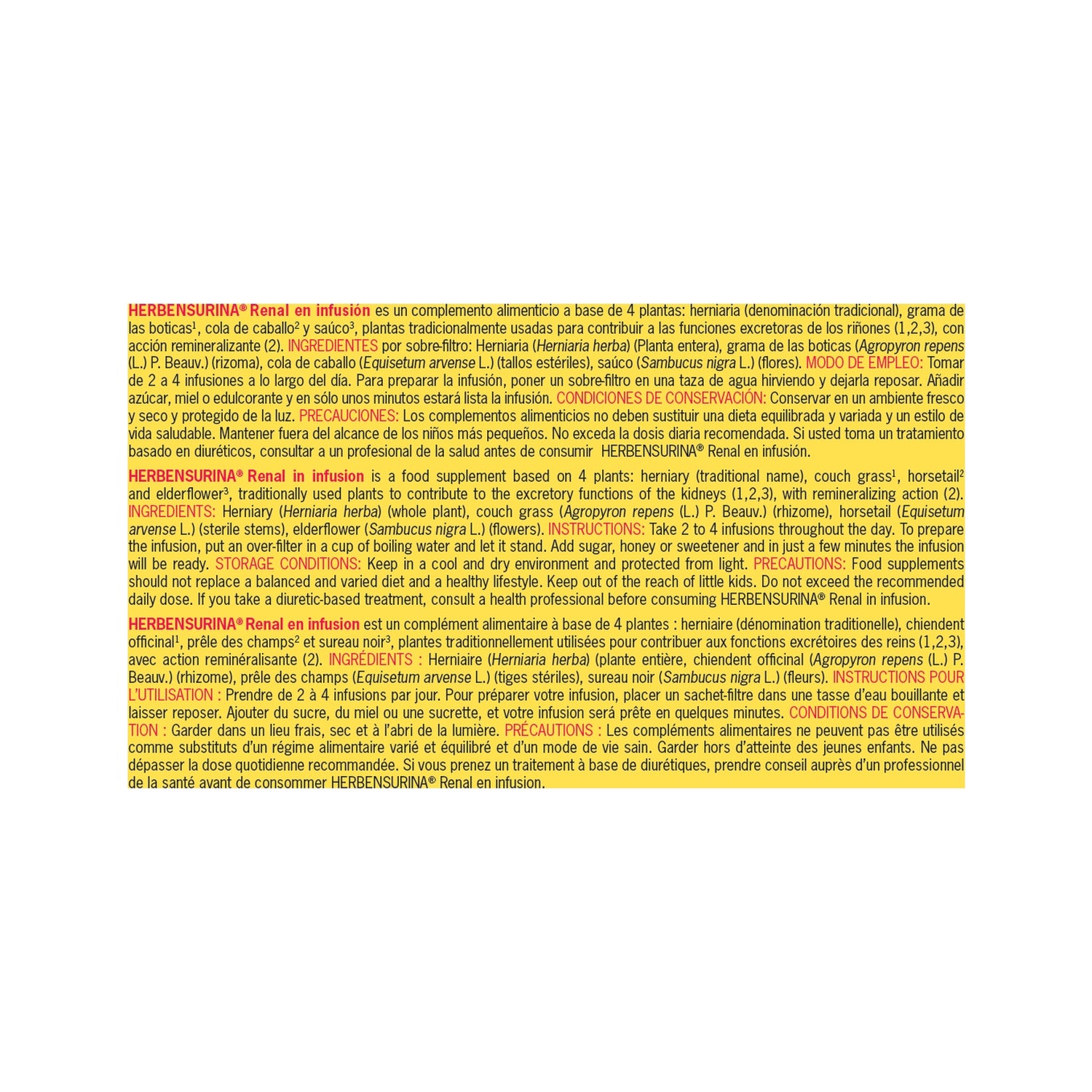 Herbensurina Renal 40 sachets is a dietary supplement in infusion format that acts as an aid for the well-being of the urinary tract and reduces the risk of developing kidney stones.