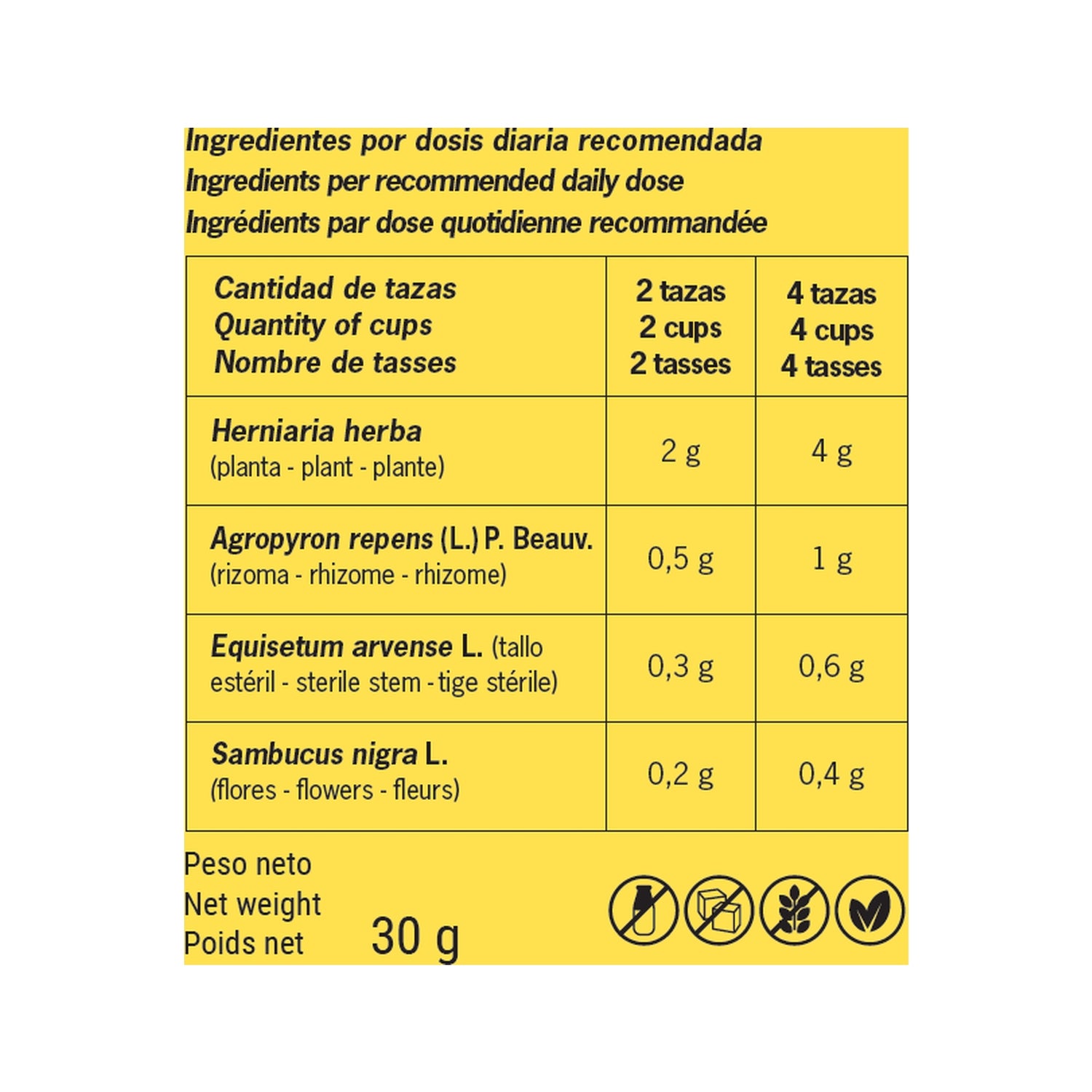 Its 100% natural formula is based on herniaria plant complemented with diuretic plants in sachet-filter format for infusion with diuretic and antibacterial action.