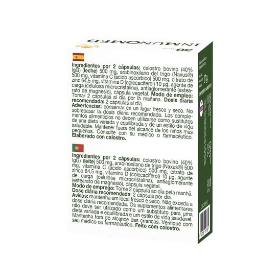 Food supplement formulated with bovine colostrum and zinc. Contributes to strengthen the immune system and improve the functioning of the intestinal flora. Enriched with vitamins C and D, which help to reduce the feeling of tiredness and increase the absorption of calcium in the bones. In addition, it favors the elimination of pathogens from the body and promotes muscular and intellectual performance.