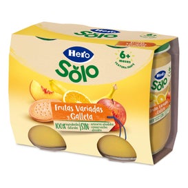 Hero Merienda Frutas Variadas y Galleta 2x190 g is a pack of two jars of 190 g of mixed fruit puree with cookie, suitable for babies from 6 months. It is designed for complementary feeding and to provide a practical snack.