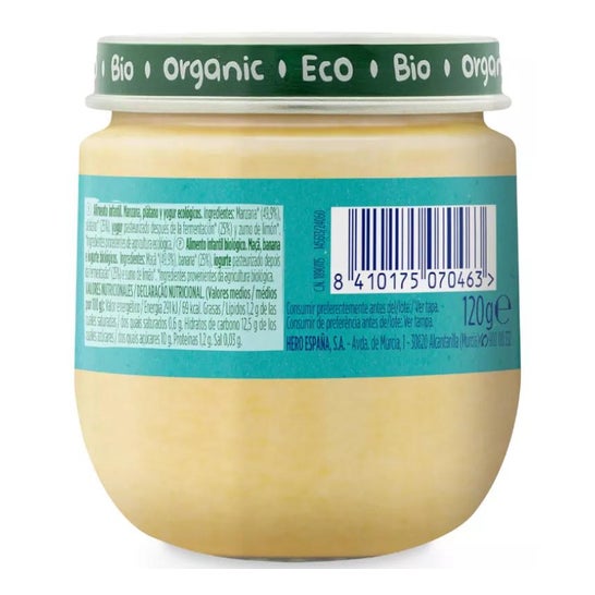 Organic baby food with apple, banana and yogurt for babies from 6 months. Recipe designed to offer a balanced and healthy diet. Contains organically produced and steamed ingredients, free of gluten, egg, dairy, additives, preservatives and colourings.