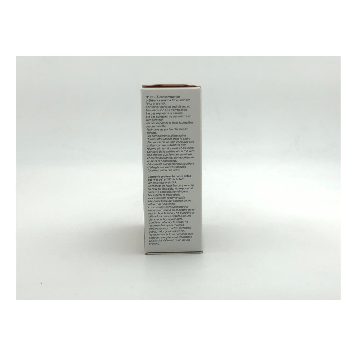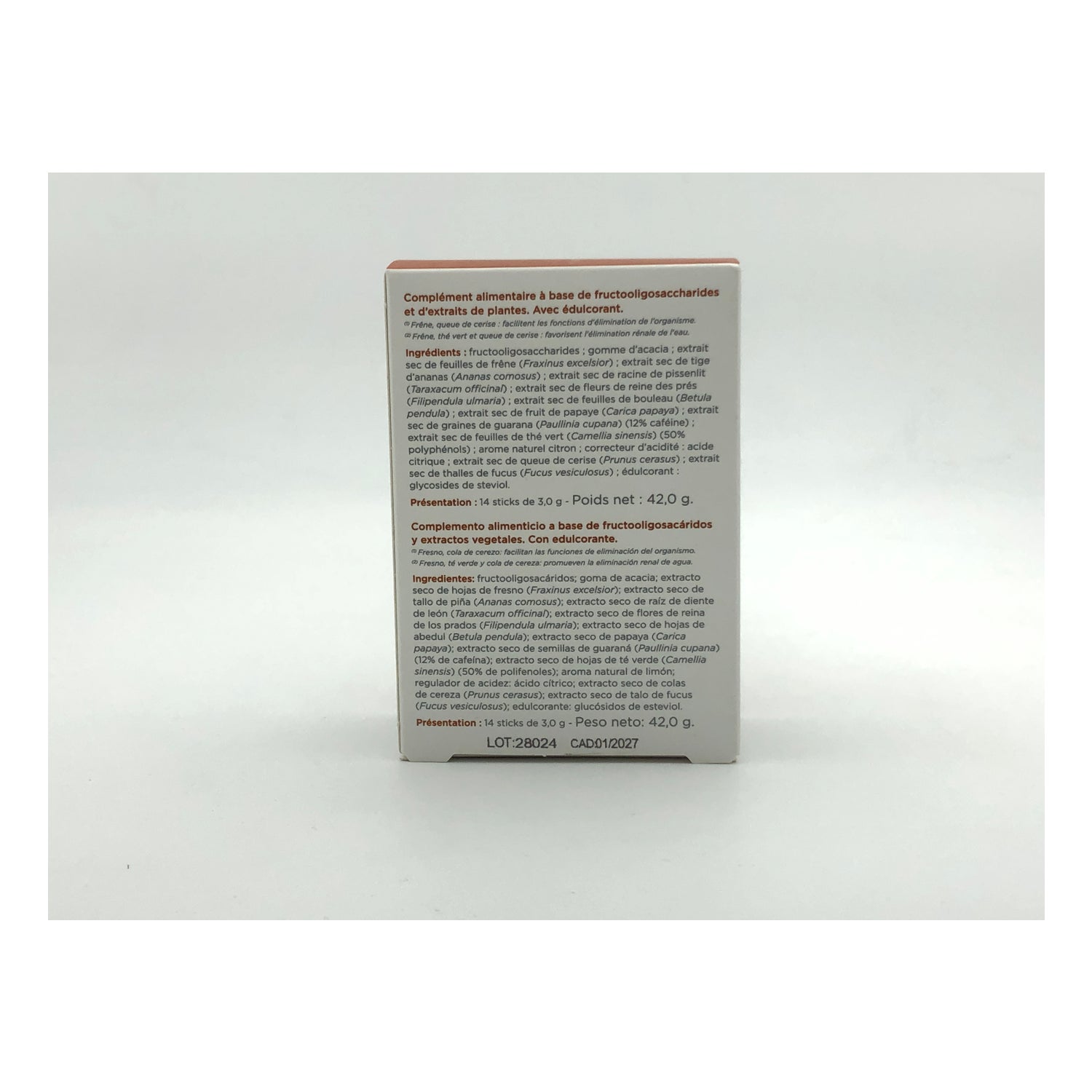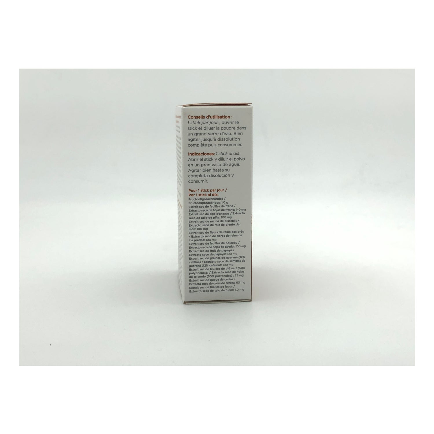 Fructooligosaccharides, Acacia gum, Dry extract of leaves of Ash (Fraxinus Excelsior), Dry extract of stem of Pineapple (Ananas Comosus), Dry extract of root of Dandelion (Taraxacum Officinale), Dry extract of flowers of Meadowsweet (Filipendula Ulmaria), Dry extract of leaves of Birch (Betula Pendula), Dry extract of Papaya (Carica Papaya), Dry extract of Guarana seeds (Paullinia Cupana) (12% caffeine), Dry extract of Green Tea leaves (Camellia Sinensis) (50% polyphenols), Natural Lemon flavouring, Acidity regulator (Citric Acid), Dry extract of Cherry tails (Prunus Cerasus), Dry extract of Fucus thallus (Fucus Vesiculosus), Sweetener (Steviol glycosides).