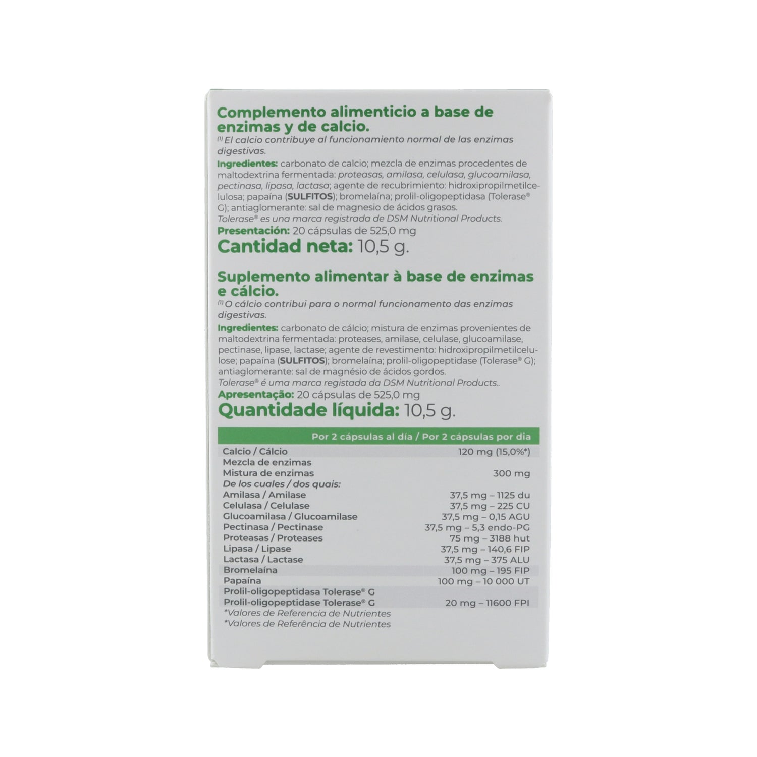 Dietary supplement based on digestive enzymes and calcium. Formulated with a complex of 11 enzymes capable of degrading all categories of macronutrients: proteins, lipids, carbohydrates and fibres. Contains lactase to facilitate lactose digestion. Contains Prolyl-oligopeptidase (Tolerase® G) microencapsulated specifica to facilitate the digestion of gluten.