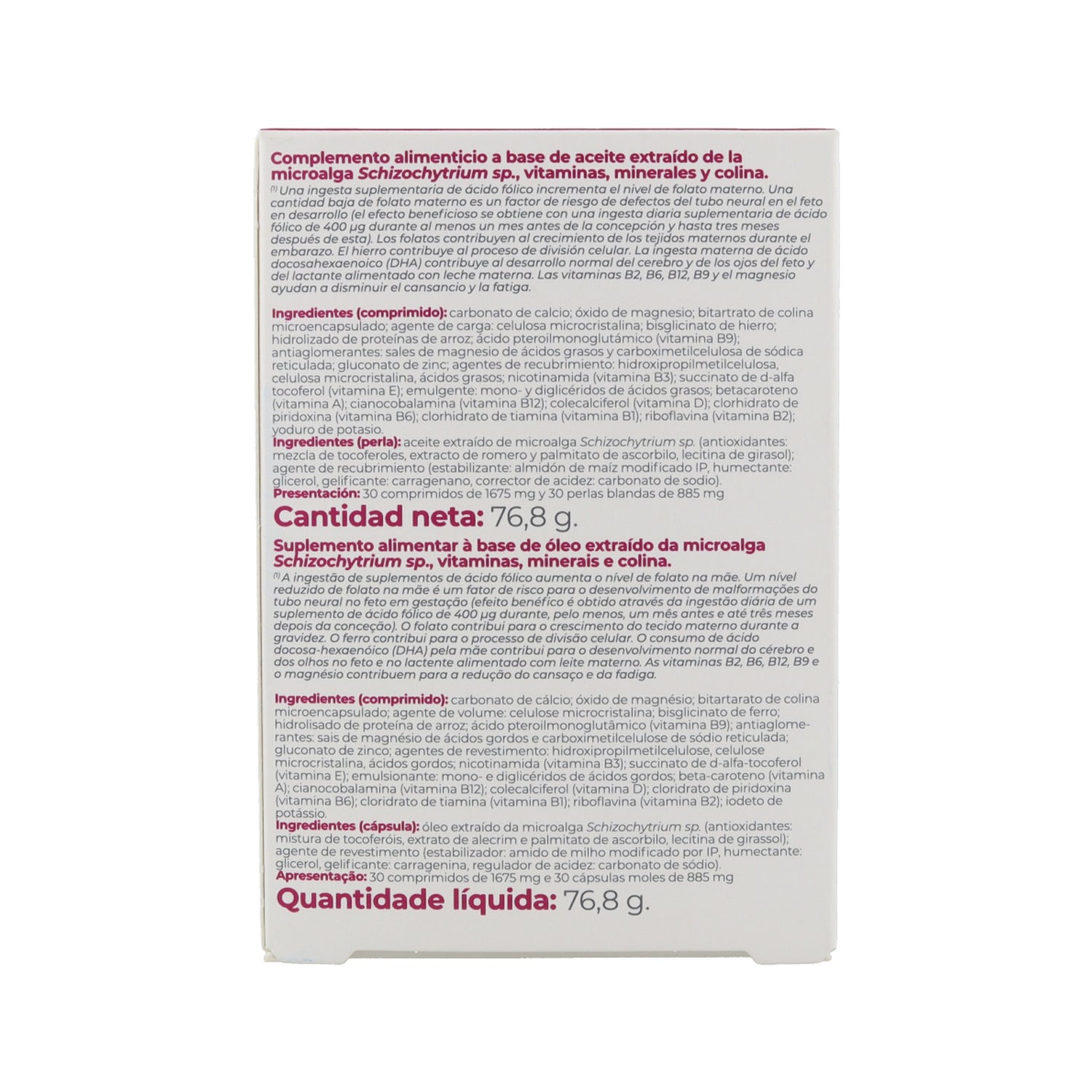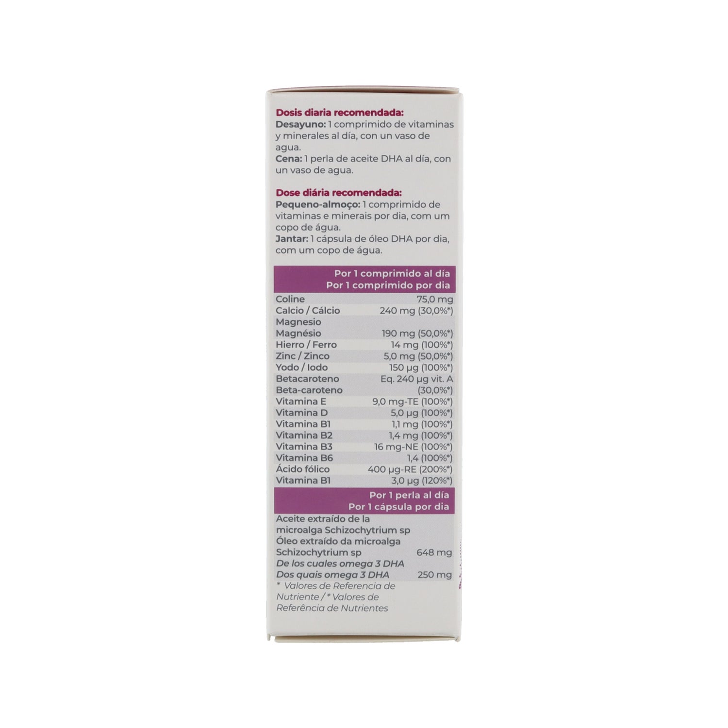 MINERALS: Calcium carbonate, loading agent (corn starch), marine magnesium oxide, iron gluconate, rice protein hydrolysate, folic acid (vitamin b9), loading agent (maltodextrin), aAscorbic acid (vitamin c), zinc gluconate, anti-caking agent (magnesium stereate), nicotinamide (vitamin b3), d-alpha-tocopherol succinate (vitamin e), emulsifiers (mono and di-alglycerides of áFatty acids of vegetable origin), beta-carotene, loading agents (sodium alginate), thickeners (acacia gum, starch)(n), cyanocobalamin (vitamin b12), loading agent (dicalcium phosphate), cholecalciferol (vitamin d), loading agents (starch)MODIFIED N, MALTODEXTRIN), ANTIOXIDANTS (SODIUM ASCORBATE, ALPHA-T TOCOPHEROLS, CANOLA OIL), PYRIDOXINE (VITAMIN B6), THIAMIN HYDROCHLORIDE (VITAMIN B1), RIBOFLAVIN (VITAMIN B2), POTASSIUM IODIDE. Coating agents:[hpmc, stearic acid, microcrystalline cellulose, white vegetable coating (titanium dioxide)]. Dha oil capsule: Epax® qualitysilver® fish oil dosed in dha[docosahexaenoic acid] and epa[áEicosapentaenoic acid], antioxidants[tocopherol-rich extract, rosemary extract], capsule coating[fish gelatine, moisturizer (glycerol)].