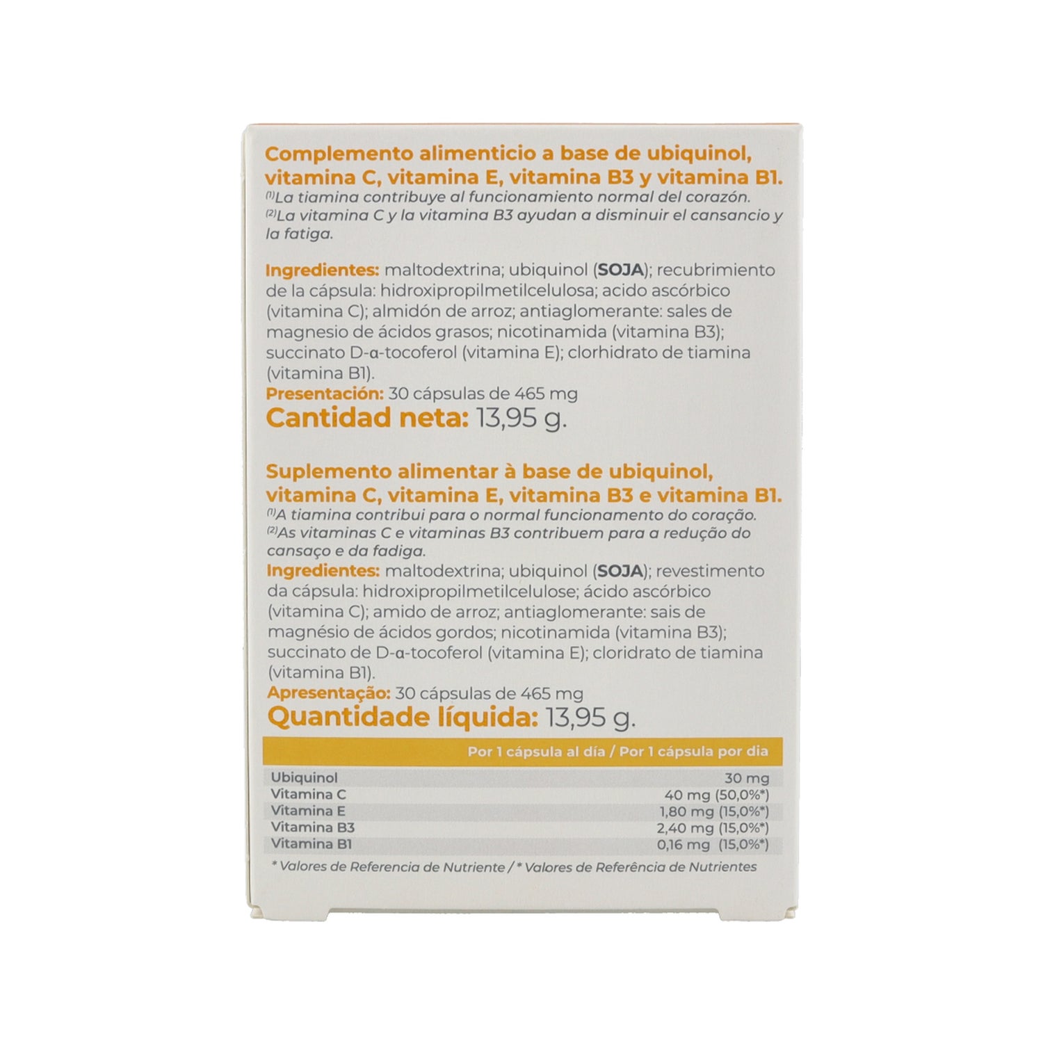 Dietary supplement based on ubiquinol, vitamin C, vitamin E, vitamin B3 and vitamin B1. Ubiquinol contributes to the contribution of beneficial properties at the cardiovascular level, in oxidative stress, in the recovery of athletes and fatigue in general. The formula combines vitamins B1-B3, vitamin C and vitamin E to facilitate the replenishment of energy and antioxidants. It is especially indicated for people who feel fatigued and people who suffer from muscular pain or cramps on a daily basis.