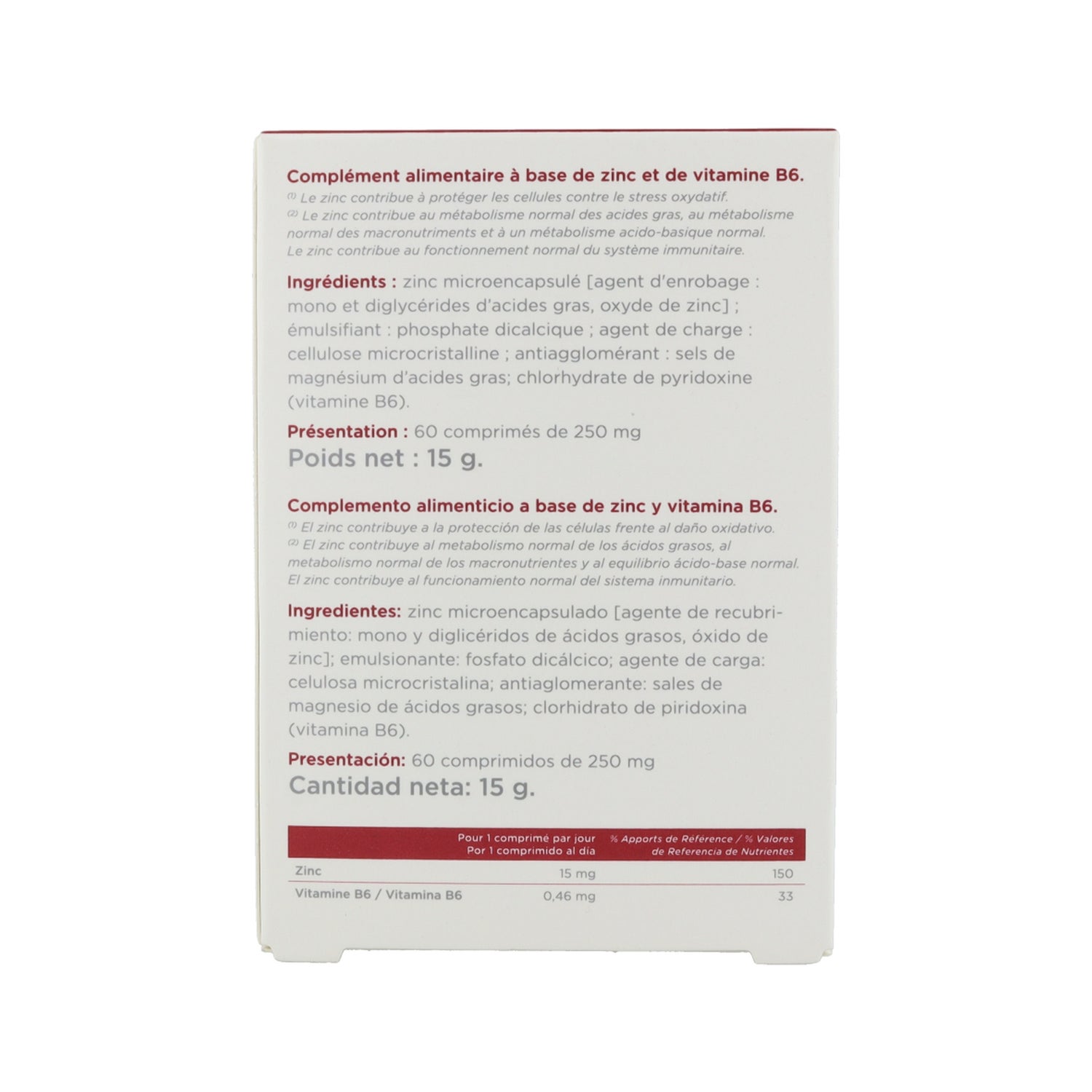Dietary supplement based on zinc and vitamin B6 that is specially formulated to promote cell protection and to act on the metabolic balance. Zinc is necessary for the proper functioning of the immune system. It also participates in the division and growth of cells, in wound healing and in the metabolism of carbohydrates. Zinc is also necessary for the senses of smell and taste.