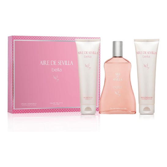 Instituto Español Aire de Sevilla Bella Set 3 pcs fragrance floral feminine includes an Eau de Toilette of 150 ml and two moisturizing body creams. It is a set designed for adult women looking for a scent for daily use and complete body care.