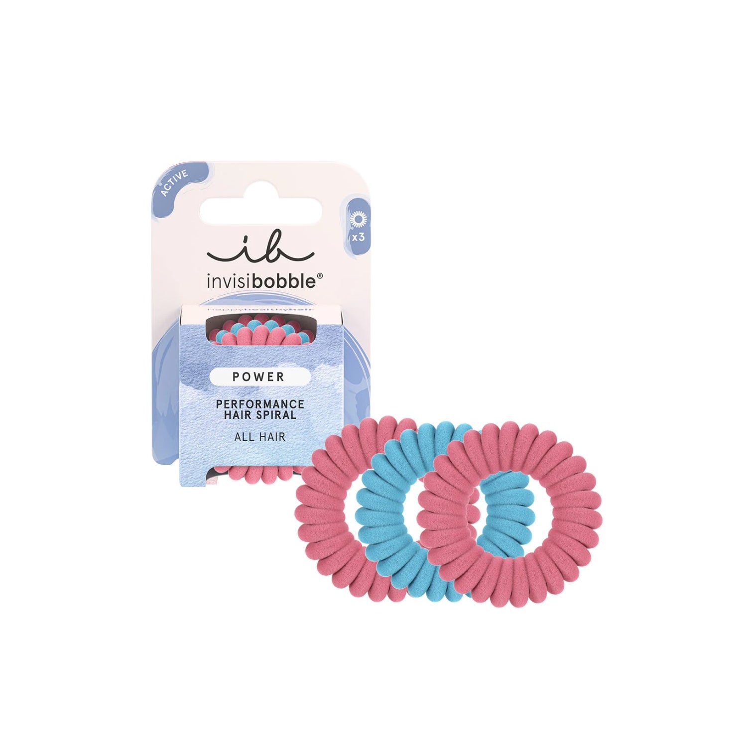 Invisibobble Power Performance Hair Spiral Rose & Ice is a pack that contains three hair ties. This product is specially designed for voluminous hair and for active people who require an extra strong hold of their hairstyle during their daily routine or while exercising.